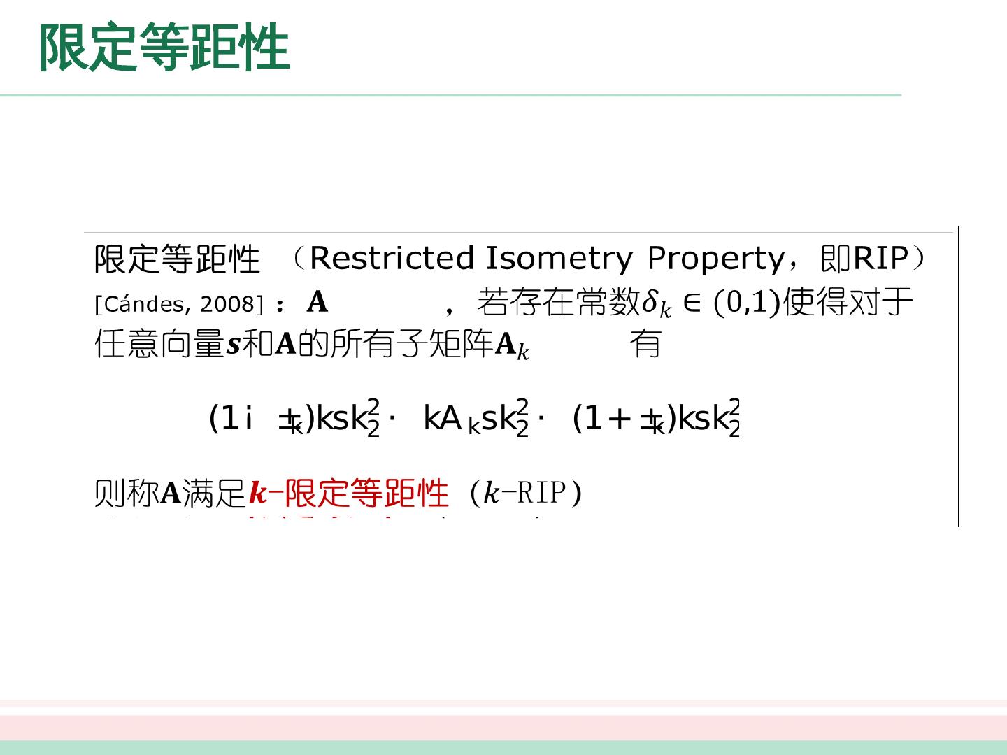 29 .限定等距 性 限定等距 性 ( Restricted Isometry Property , 即 RIP ) [ Cándes , 2008] : ,若 存在常数 使得对于任意向量 和 的所有子矩阵 有 则称 满足 - 限 定 等距 性 ( -RIP )