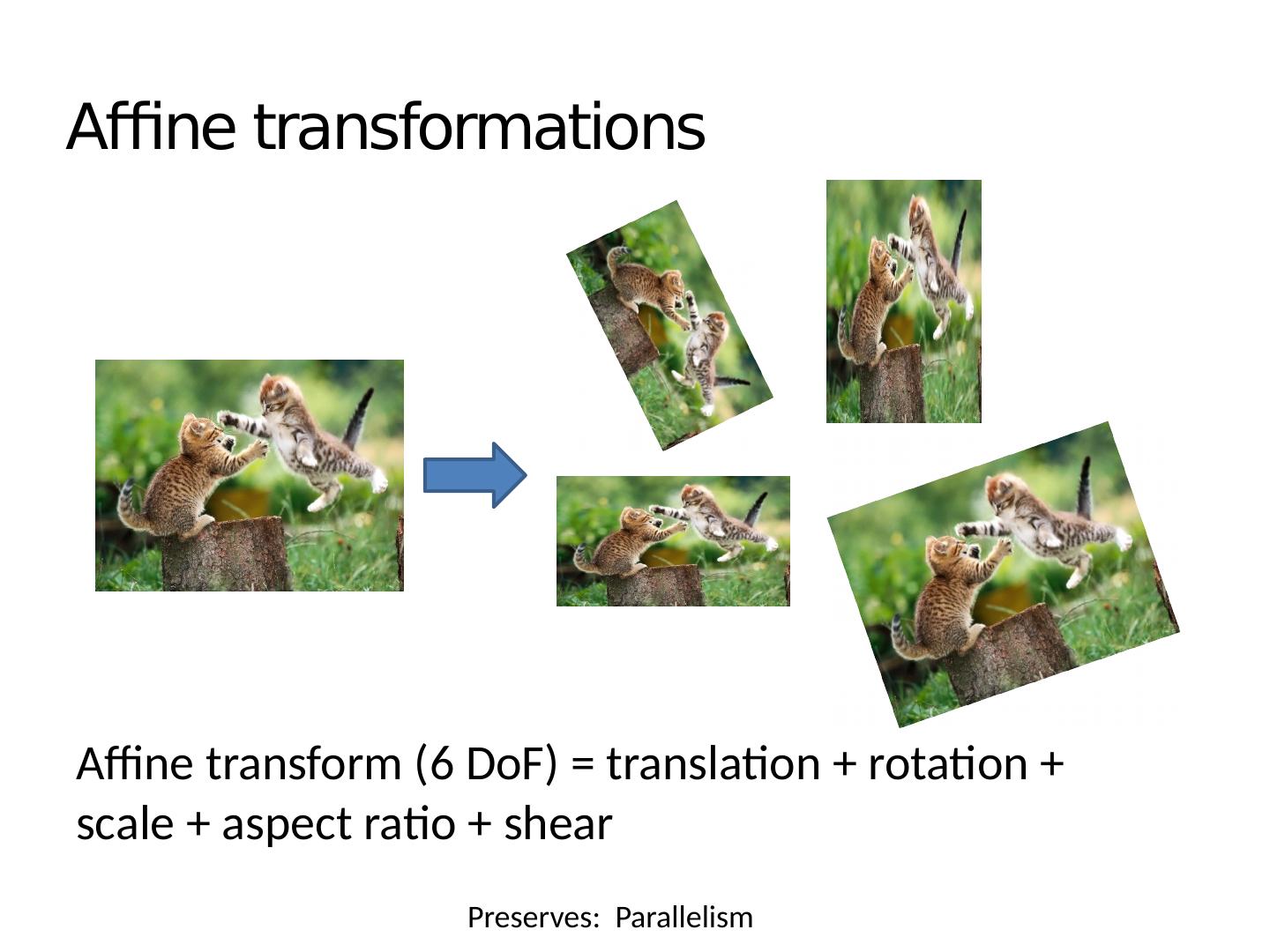 9 .Affine transformations Affine transform (6 D oF ) = translation + rotation + scale + aspect ratio + shear Preserves: Parallelism