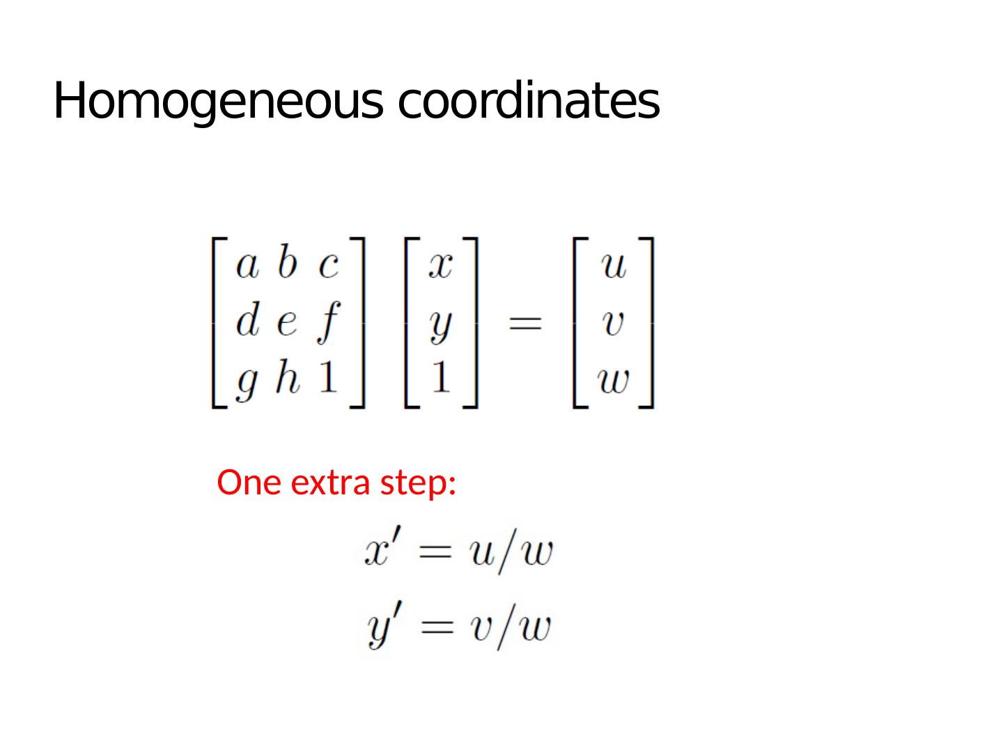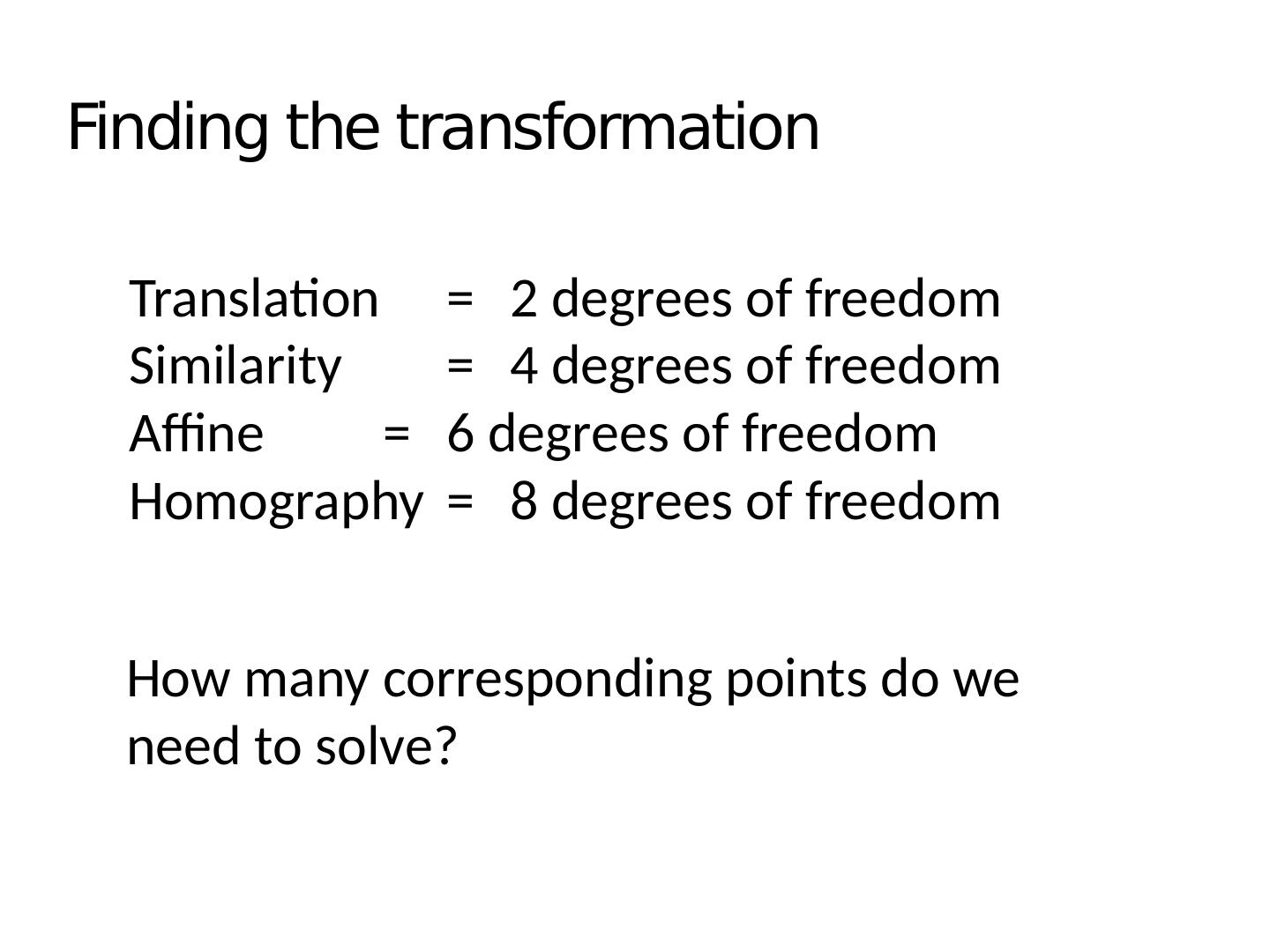 14 .Finding the transformation Translation = 2 degrees of freedom Similarity = 4 degrees of freedom Affine = 6 degrees of freedom Homography = 8 degrees of freedom How many corresponding points do we need to solve?