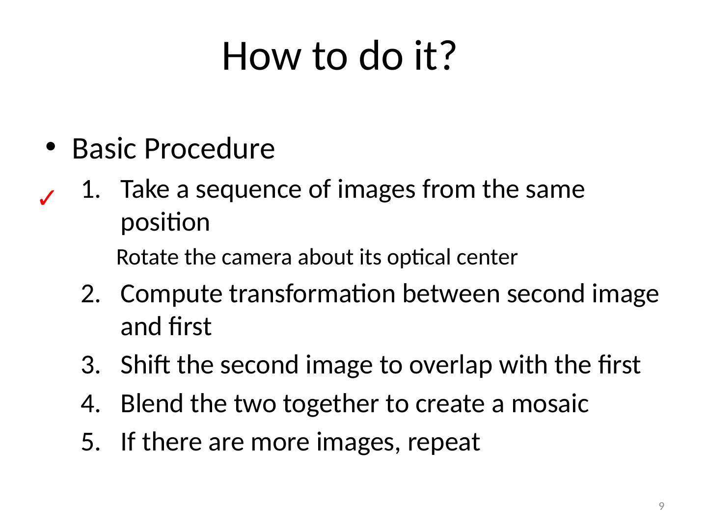 3 .How to do it? Basic Procedure Take a sequence of images from the same position (Rotate the camera about its optical center) Compute transformation between second image and first Shift the second image to overlap with the first Blend the two together to create a mosaic If there are more images, repeat 3