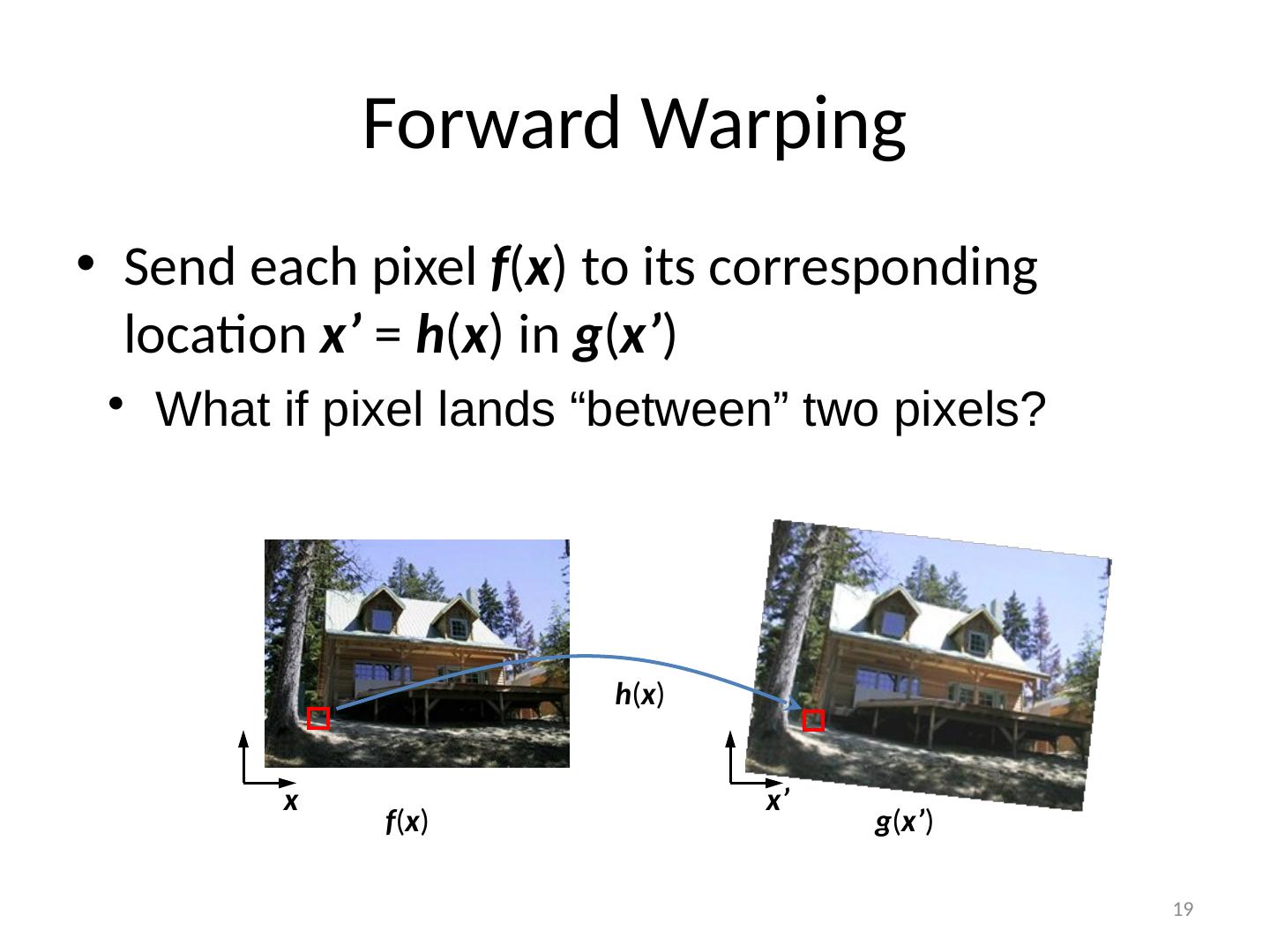 19 .Forward Warping Send each pixel f ( x ) to its corresponding location x’ = h ( x ) in g ( x’ ) f ( x ) g ( x’ ) x x’ h ( x ) What if pixel lands “between” two pixels? 19