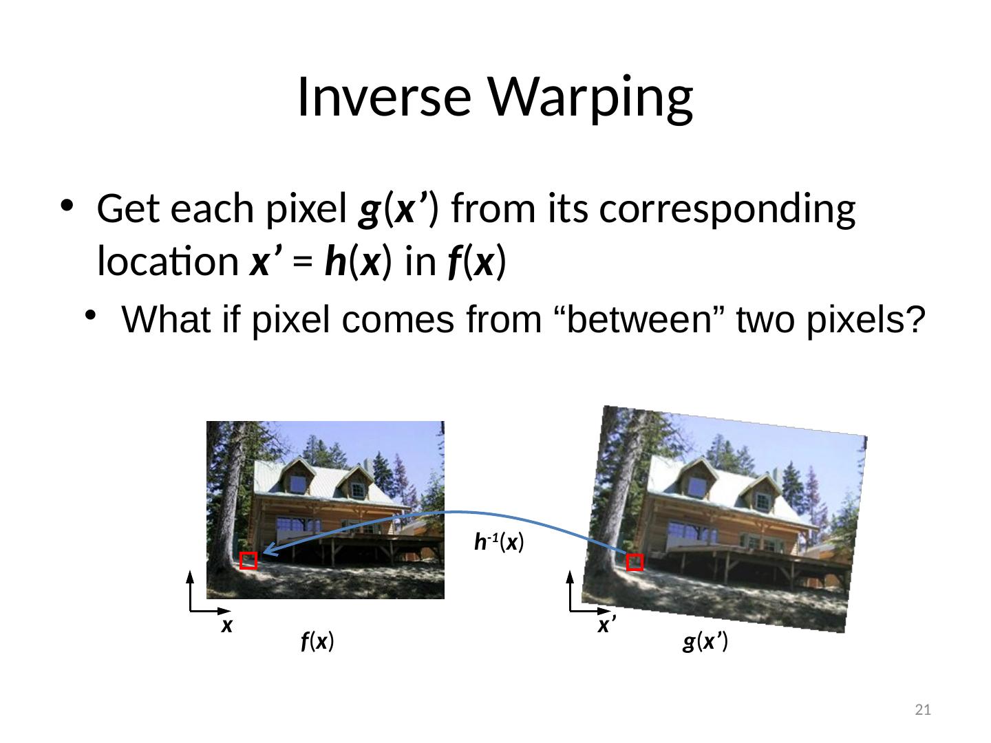 21 .21 Inverse Warping Get each pixel g ( x’ ) from its corresponding location x’ = h ( x ) in f ( x ) f ( x ) g ( x’ ) x x’ h -1 ( x ) What if pixel comes from “between” two pixels?