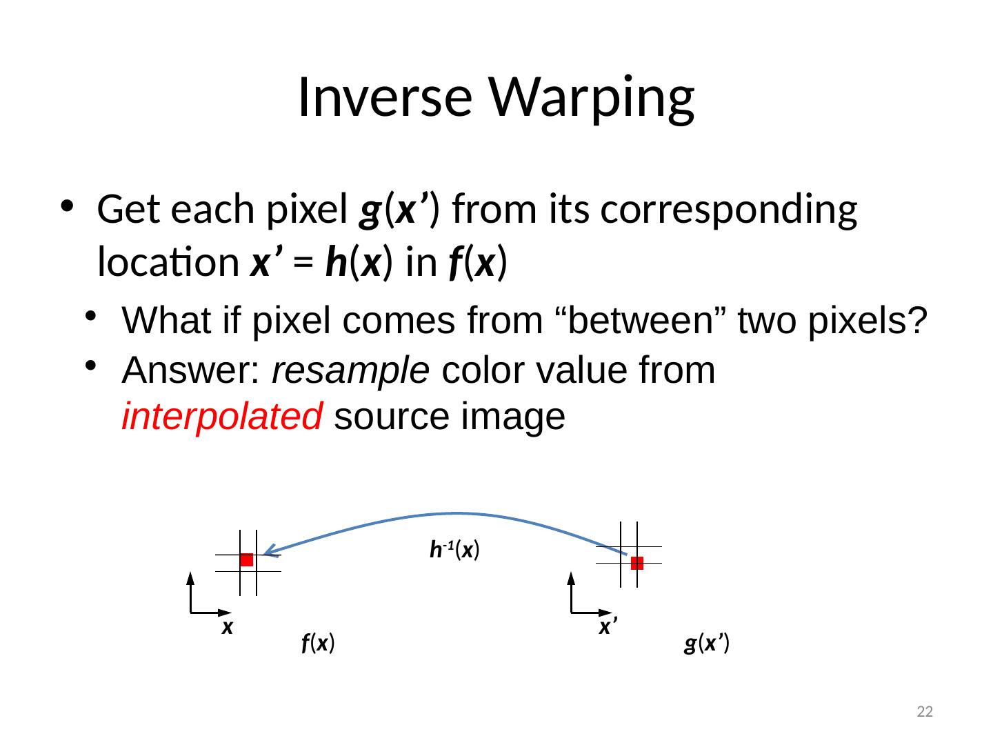 22 .22 Inverse Warping Get each pixel g ( x’ ) from its corresponding location x’ = h ( x ) in f ( x ) What if pixel comes from “between” two pixels ? Answer: resample color value from interpolated source image f ( x ) g ( x’ ) x x’ h -1 ( x )