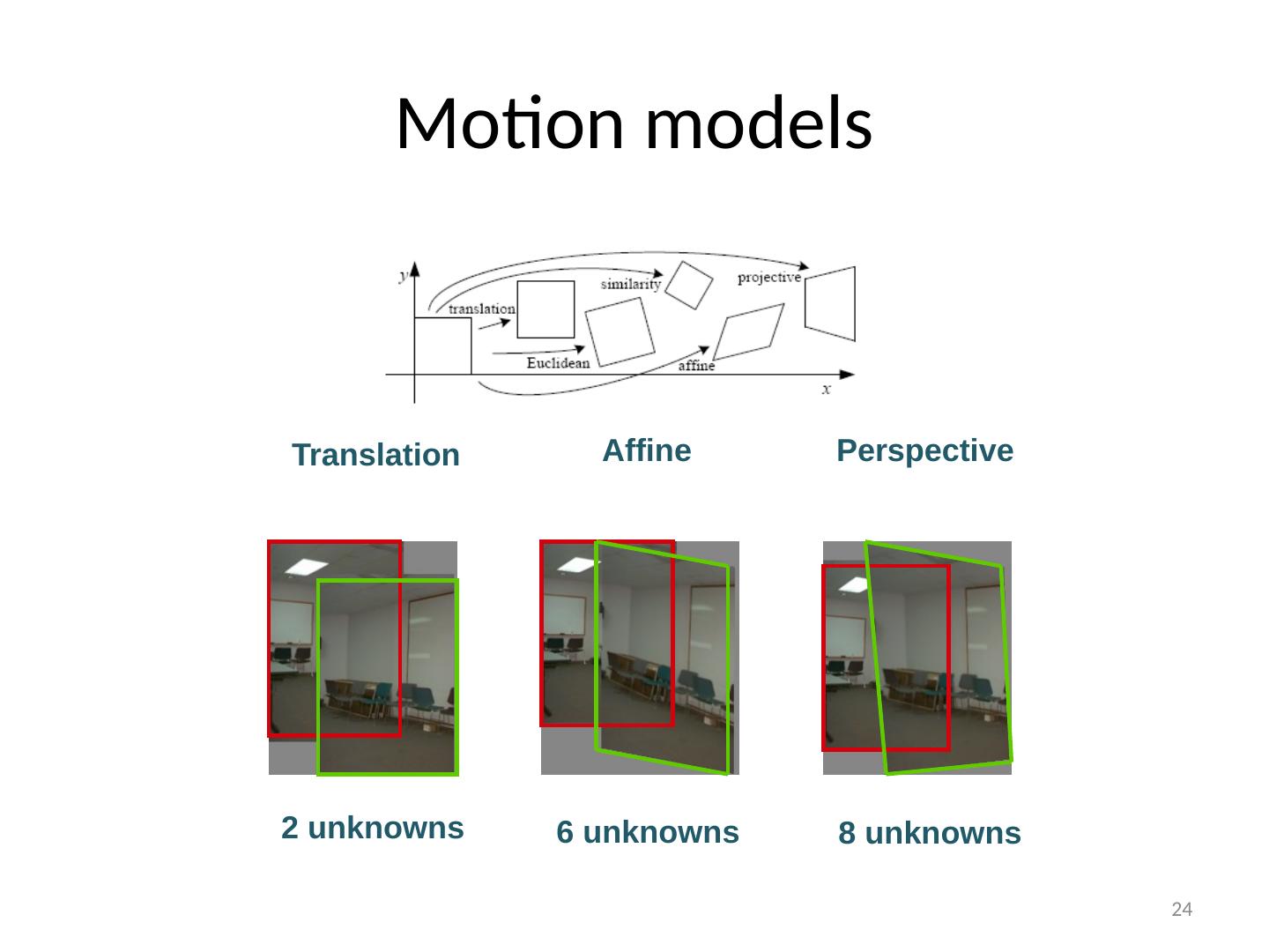 24 .Motion models Translation 2 unknowns Affine 6 unknowns Perspective 8 unknowns 24