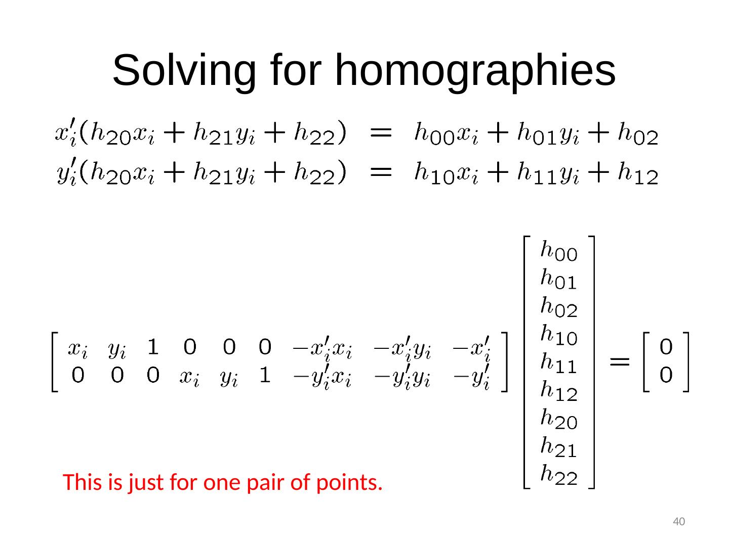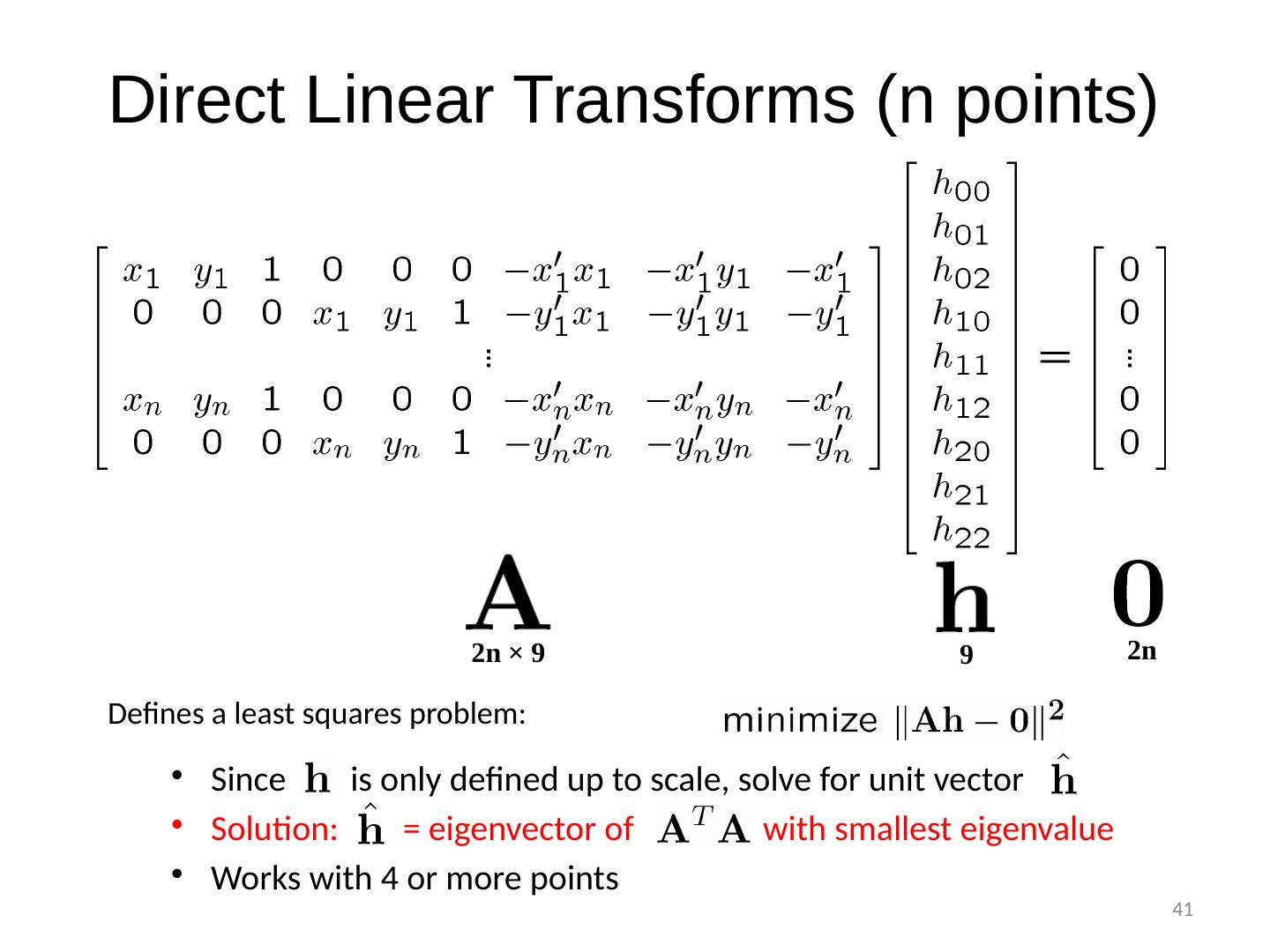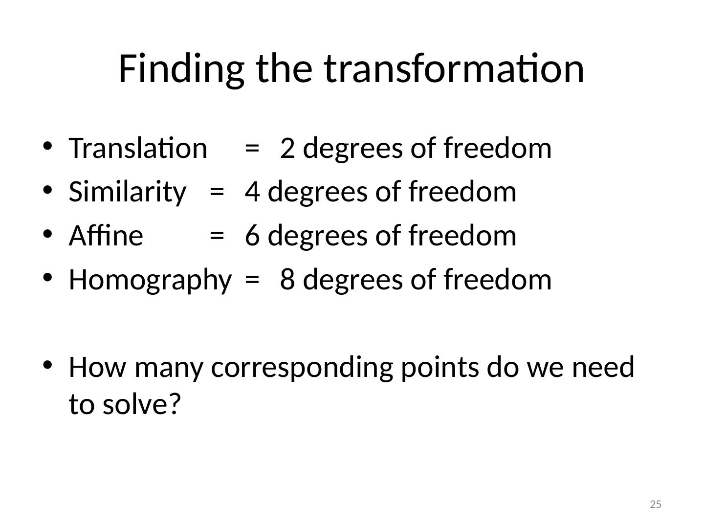 25 .Finding the transformation Translation = 2 degrees of freedom Similarity = 4 degrees of freedom Affine = 6 degrees of freedom Homography = 8 degrees of freedom How many corresponding points do we need to solve? 25