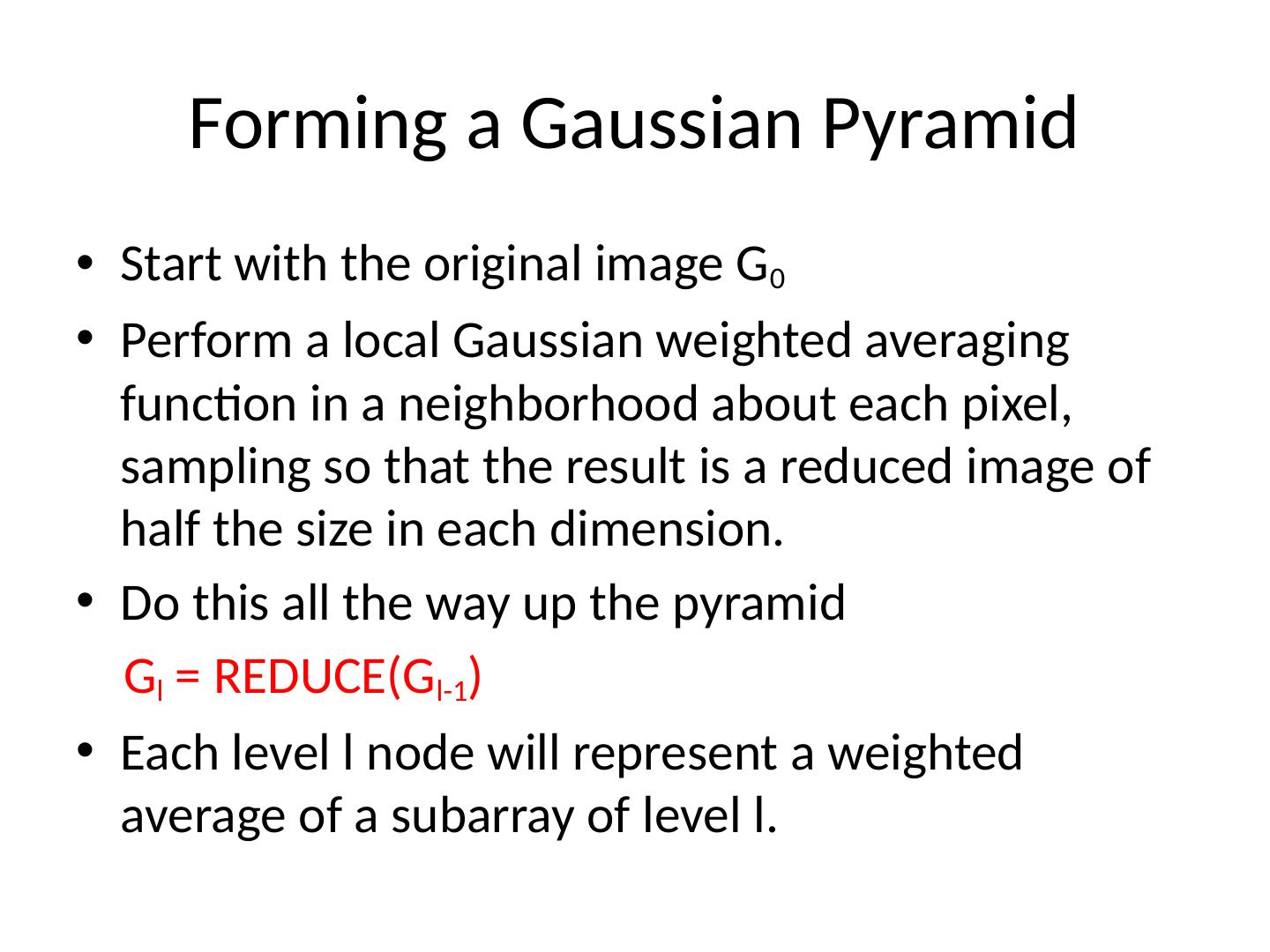11 .Forming a Gaussian Pyramid Start with the original image G 0 Perform a local Gaussian weighted averaging function in a neighborhood about each pixel, sampling so that the result is a reduced image of half the size in each dimension. Do this all the way up the pyramid G l = REDUCE(G l-1 ) Each level l node will represent a weighted average of a subarray of level l.