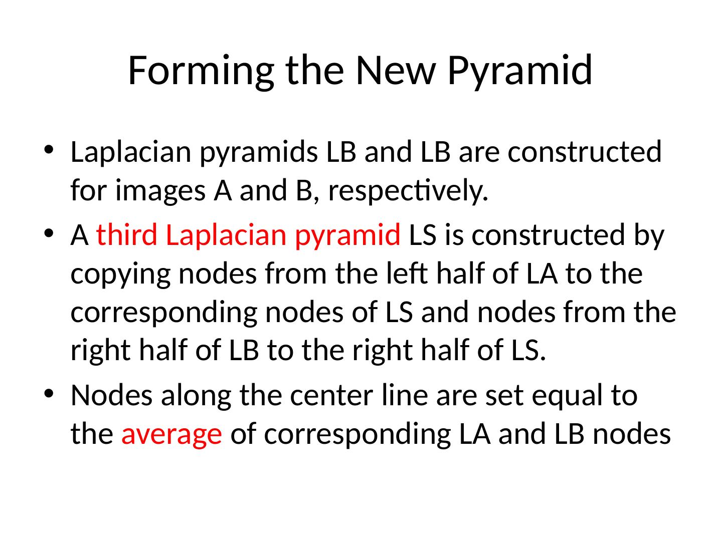 15 .Forming the New Pyramid Laplacian pyramids LB and LB are constructed for images A and B, respectively. A third Laplacian pyramid LS is constructed by copying nodes from the left half of LA to the corresponding nodes of LS and nodes from the right half of LB to the right half of LS. Nodes along the center line are set equal to the average of corresponding LA and LB nodes