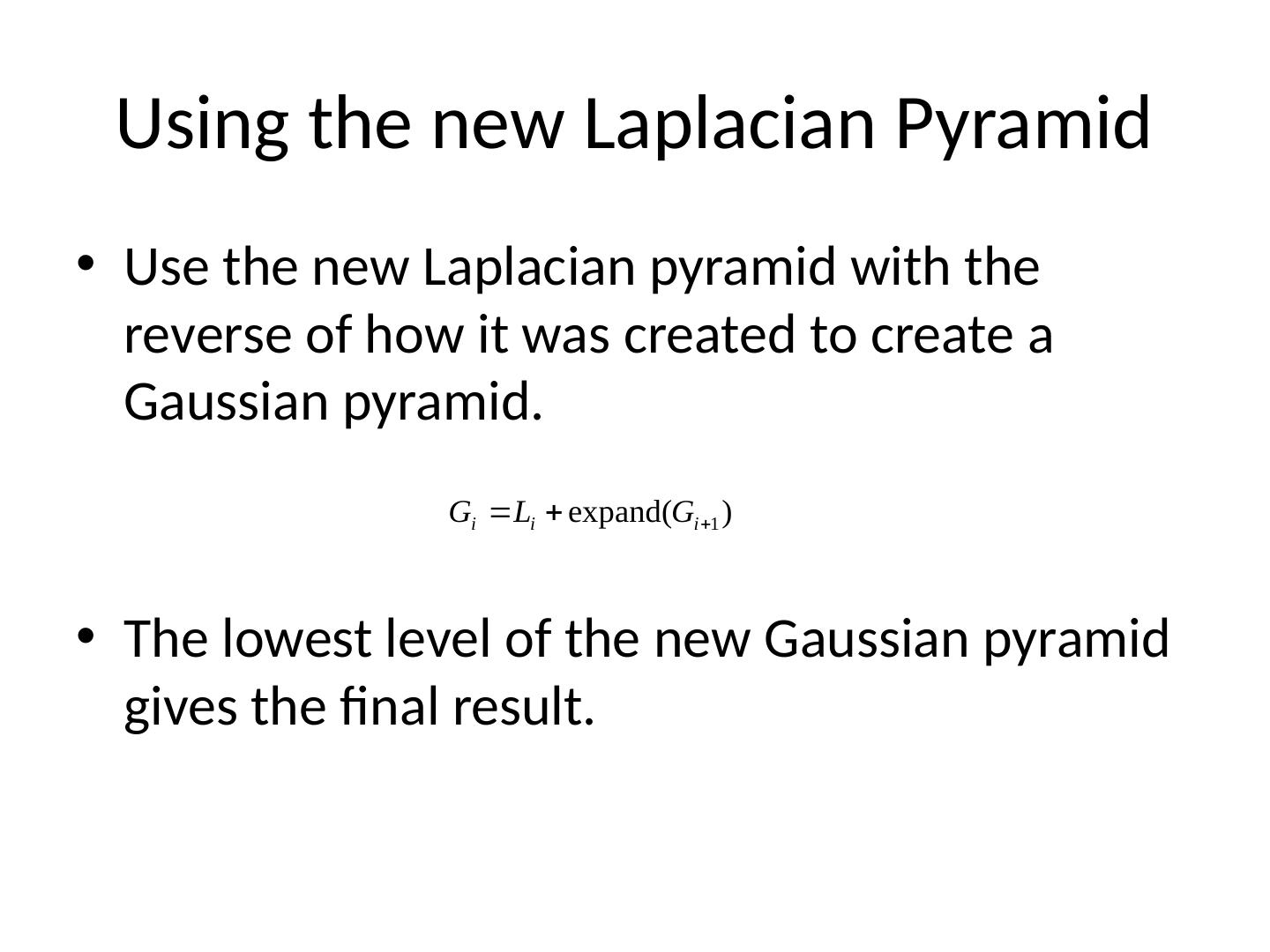 16 .Using the new Laplacian Pyramid Use the new Laplacian pyramid with the reverse of how it was created to create a Gaussian pyramid. The lowest level of the new Gaussian pyramid gives the final result.