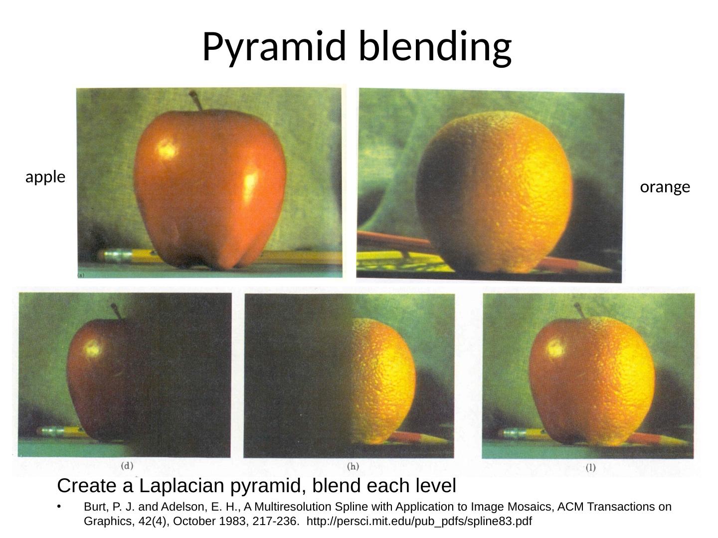 10 .Pyramid blending Create a Laplacian pyramid, blend each level Burt, P. J. and Adelson, E. H ., A Multiresolution Spline with Application to Image Mosaics, ACM Transactions on Graphics, 42(4), October 1983, 217-236. http ://persci.mit.edu/pub_pdfs/spline83.pdf apple orange