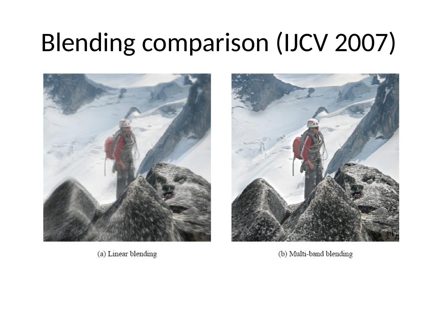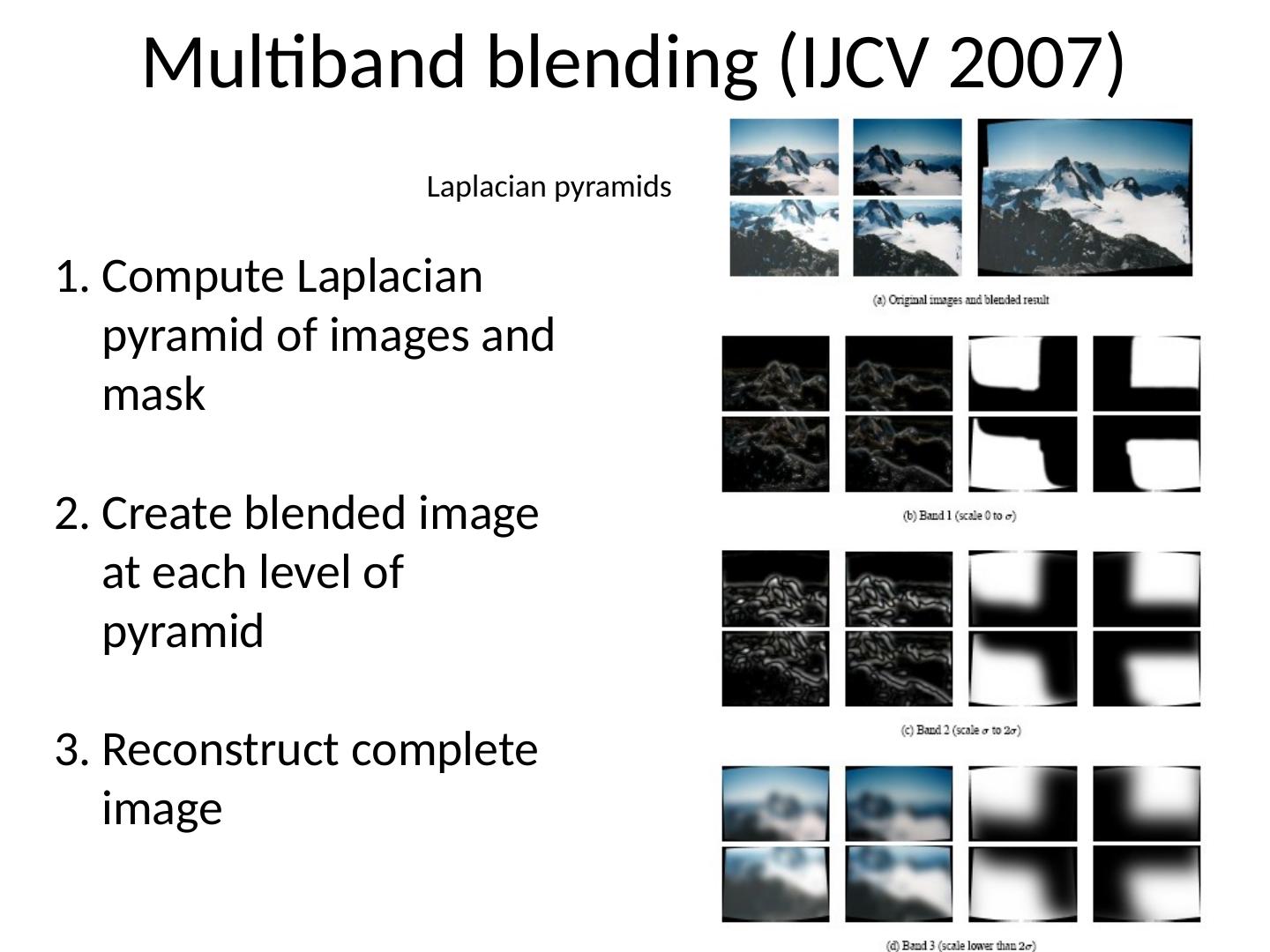 19 .Multiband blending (IJCV 2007) Compute Laplacian pyramid of images and mask Create blended image at each level of pyramid Reconstruct complete image Laplacian pyramids