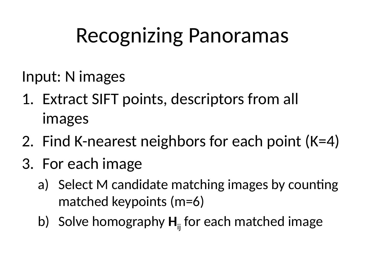 27 .Recognizing Panoramas Input: N images Extract SIFT points, descriptors from all images Find K-nearest neighbors for each point (K=4) For each image Select M candidate matching images by counting matched keypoints (m=6) Solve homography H ij for each matched image
