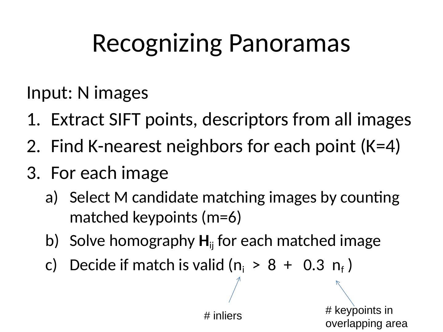 28 .Recognizing Panoramas Input: N images Extract SIFT points, descriptors from all images Find K-nearest neighbors for each point (K=4) For each image Select M candidate matching images by counting matched keypoints (m=6) Solve homography H ij for each matched image Decide if match is valid ( n i > 8 + 0.3 n f ) # inliers # keypoints in overlapping area