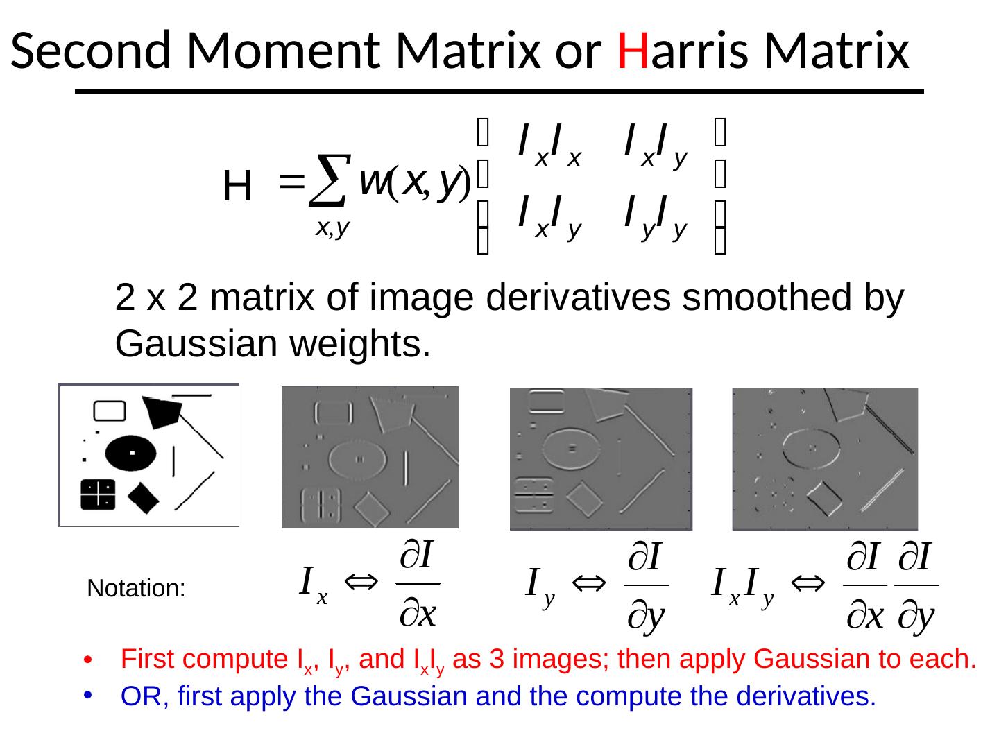 9 .Second Moment Matrix or H arris Matrix 2 x 2 matrix of image derivatives smoothed by Gaussian weights. Notation: First compute I x , I y , and I x I y as 3 images; then apply Gaussian to each . OR, first apply the Gaussian and the compute the derivatives. H