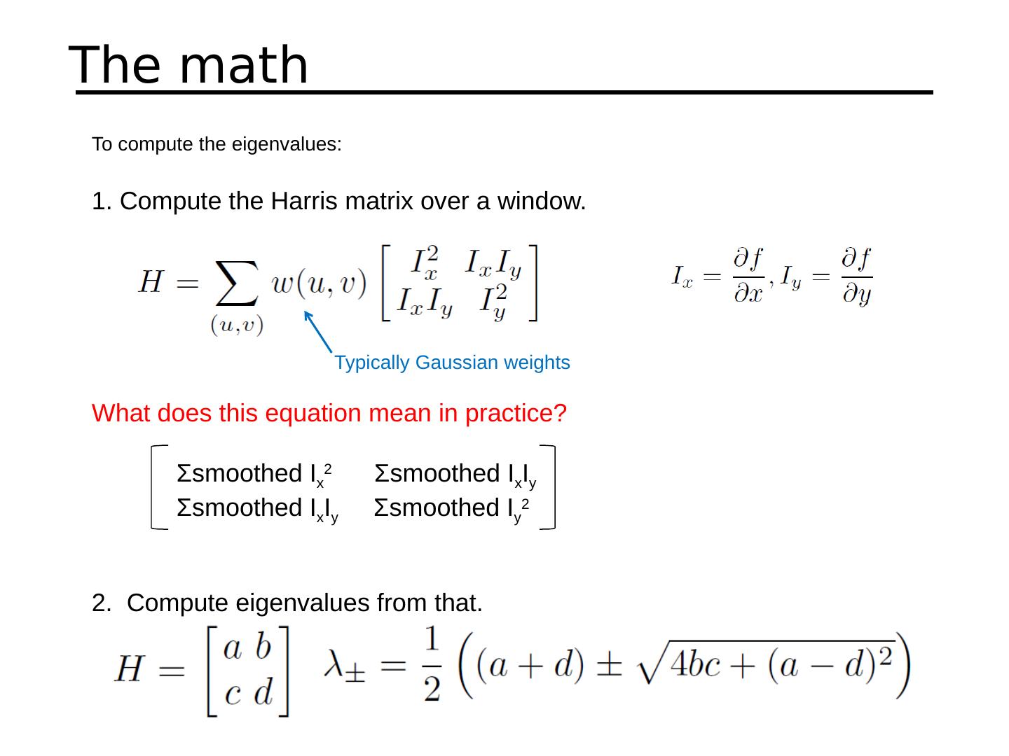 10 .The math To compute the eigenvalues: Compute the Harris matrix over a window. What does this equation mean in practice? Σ smoothed I x 2 Σ smoothed I x I y Σ smoothed I x I y Σ smoothed I y 2 2. Compute eigenvalues from that. Typically Gaussian weights