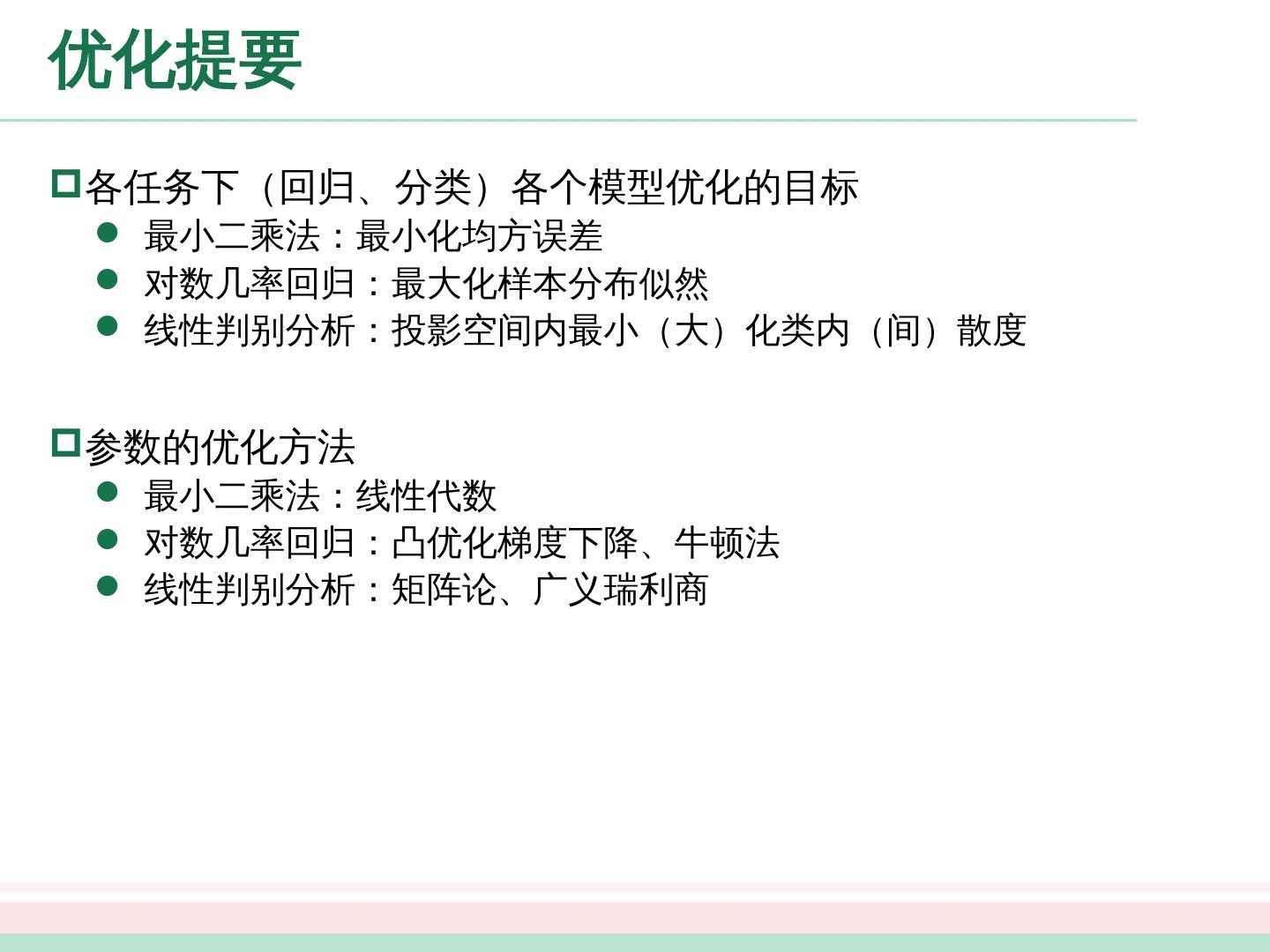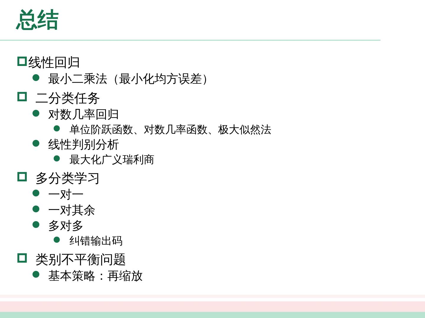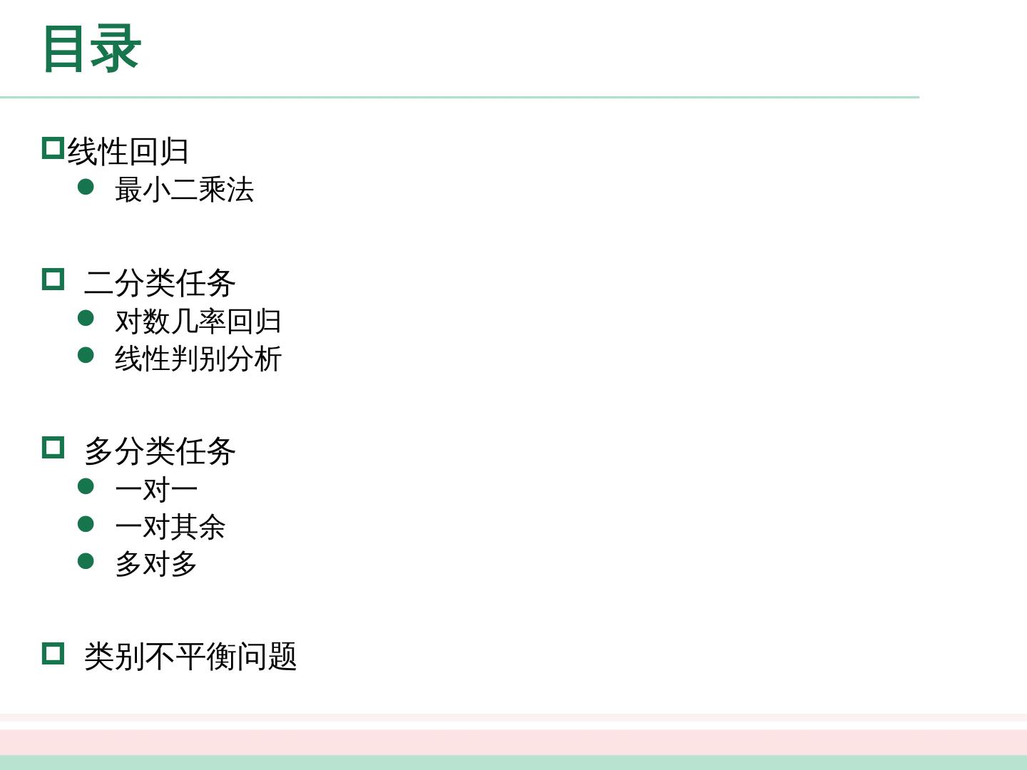 3 .目录 线性回归 最小二乘法 二 分类 任务 对数几率回归 线性判别分析 多分类任务 一对一 一对其余 多对多 类别不平衡问题