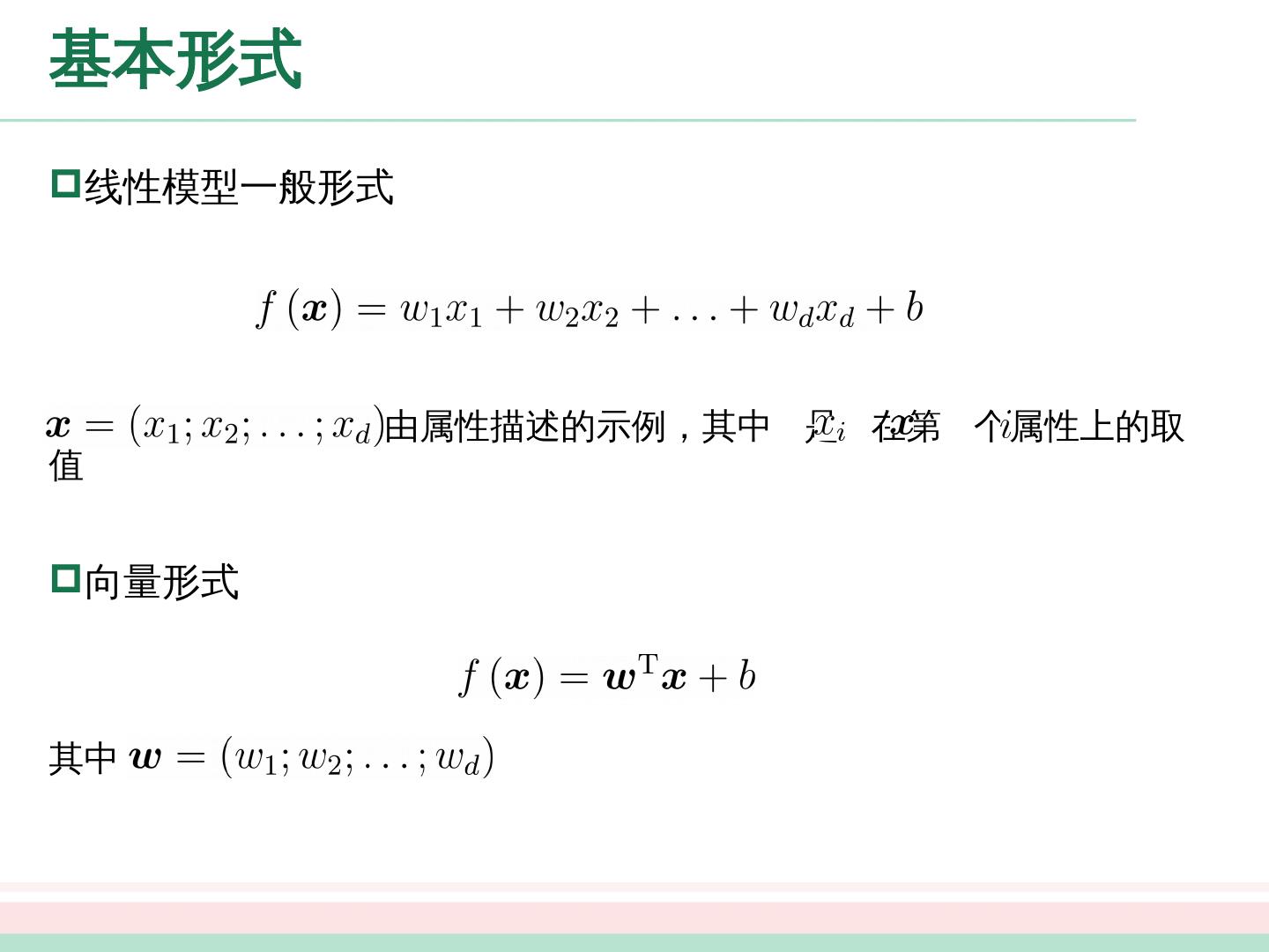 4 .基本形式 线性模型一般形式 是由属性描述的示例,其中 是 在第 个属性上的取值 向量形式 其中