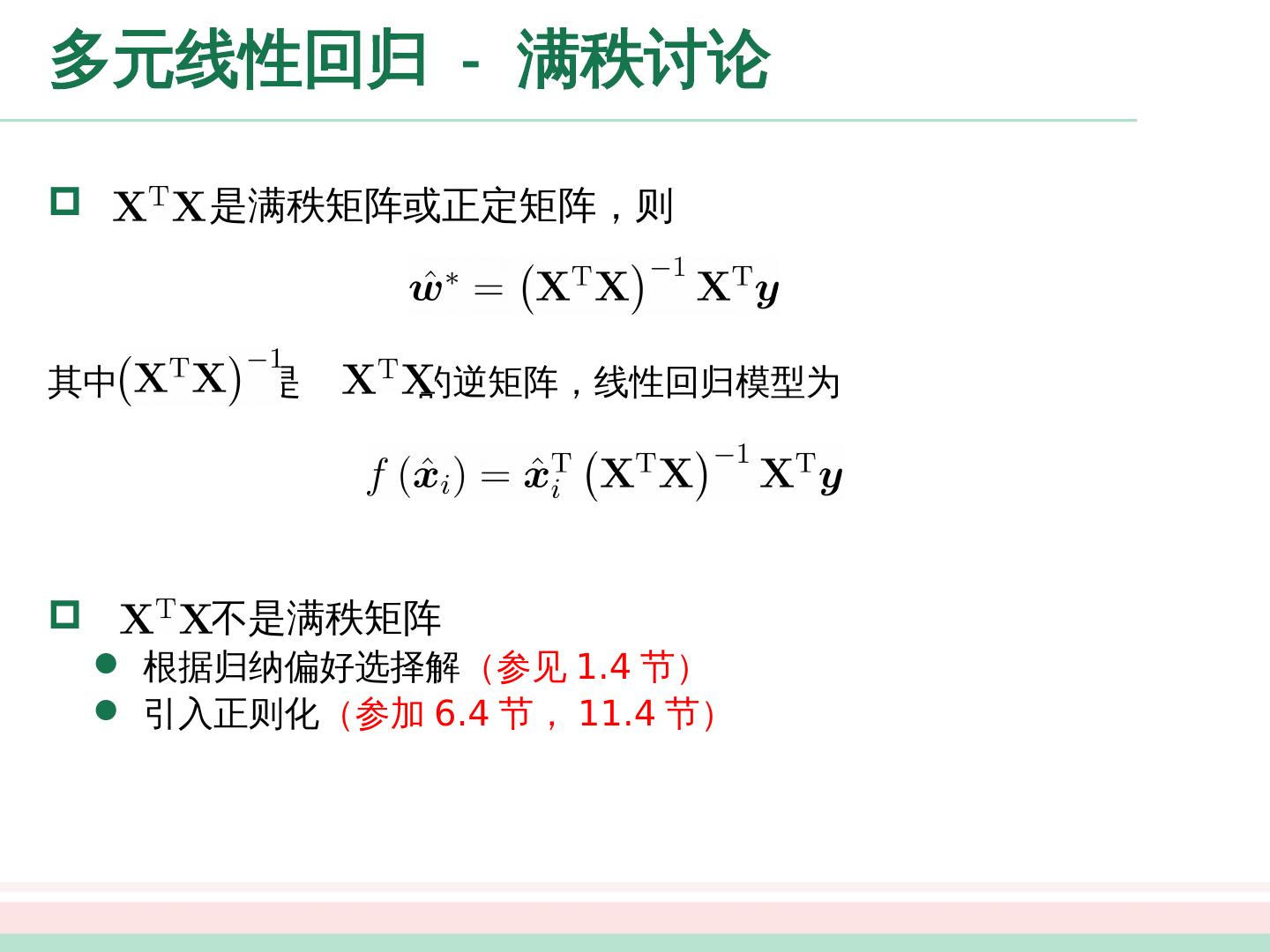 13 .多元线性回归 - 满秩讨论 是满秩矩阵或正定矩阵,则 其中 是 的逆矩阵,线性回归模型为 不是满秩矩阵 根据归纳偏好选择解 (参见 1.4 节) 引入正则化 (参加 6.4 节, 11.4 节)