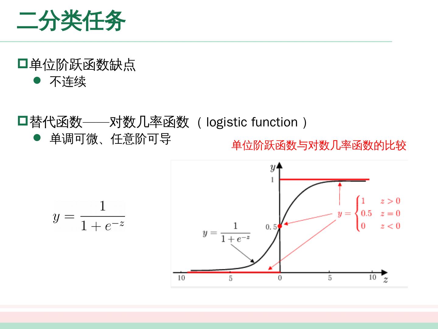16 .二分类 任务 预测值与输出标记 寻找函数将分类标记与线性回归模型输出联系起来 最理想的函数 —— 单位阶跃函数 预测值大于零就判为正例,小于零就判为反例,预测值为临界值零则可任意判别
