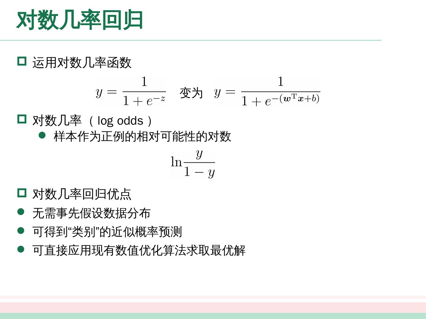 18 .对数几率回归 运用对数几率函数 对数几率( log odds ) 样本作为正例的相对可能性的对数 对数几率回归优点 无需事先假设数据分布 可得到“类别”的近似概率预测 可直接应用现有数值优化算法求取最优解 变为
