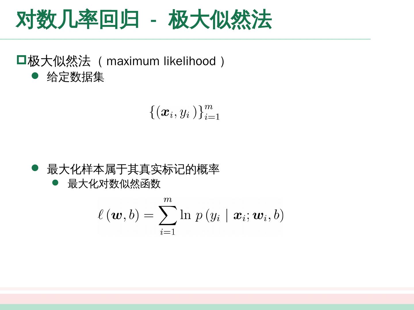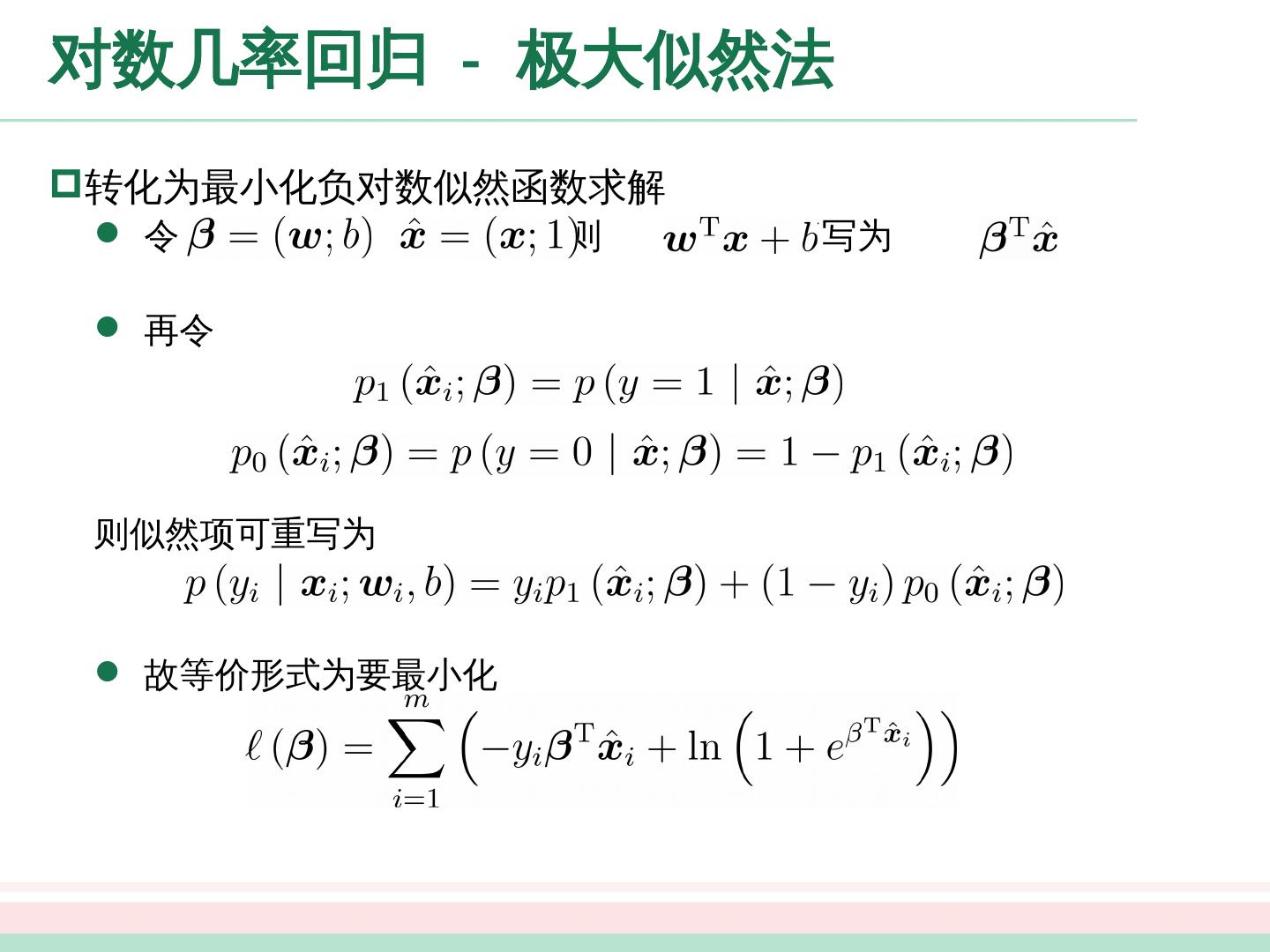 21 .对数几率回归 - 极大似然法 转化为最小化负对数似然函数求解 令 , ,则 可简写为 再令 则似然项可重写为 故等价形式为要最小化