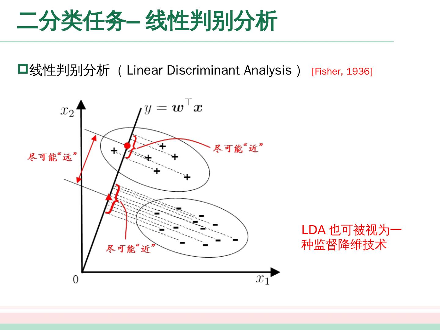 23 .二分类 任务 – 线性判别分析 线性判别分析( Linear Discriminant Analysis ) [Fisher, 1936] LDA 也可被视为一种监督降维技术