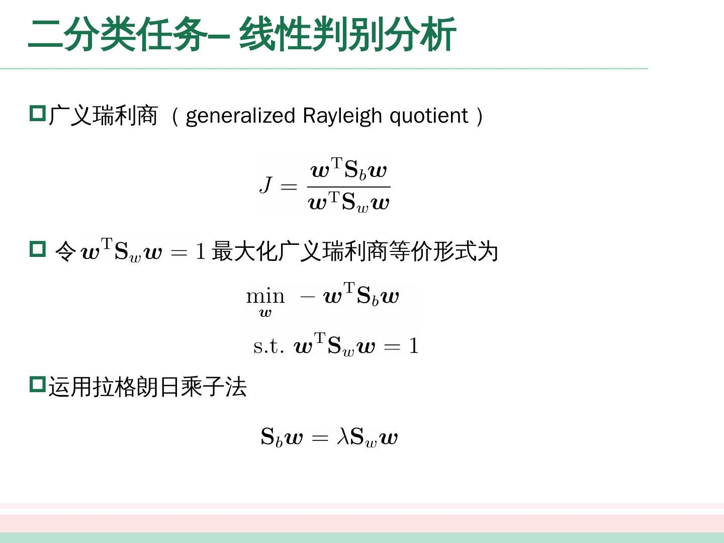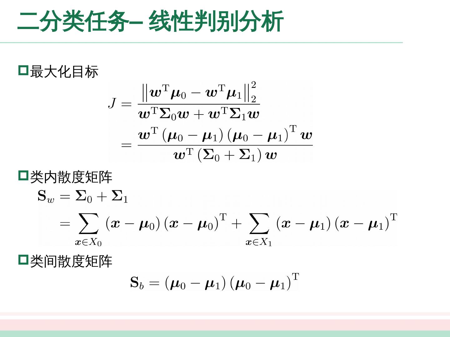25 .二分类 任务 – 线性判别分析 最大化目标 类内散度矩阵 类间散度矩阵