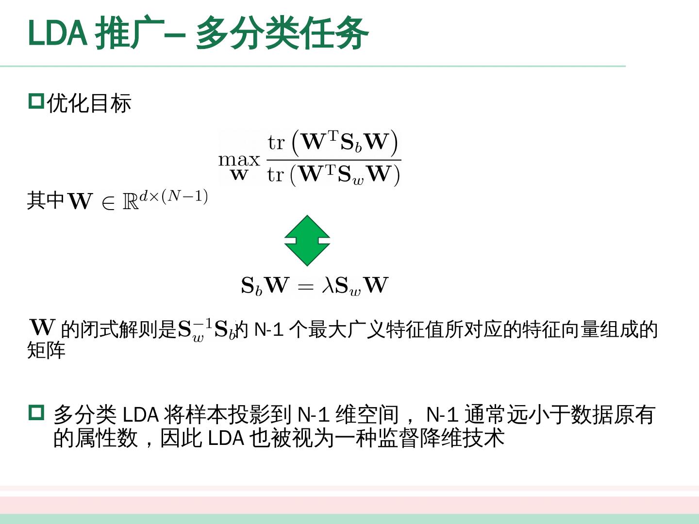 29 .LDA 推广 – 多分类任务 优化目标 其中 的闭式解则是 的 N-1 个最大广义特征值所对应的特征向量组成的矩阵 多分类 LDA 将样本投影到 N-1 维空间, N-1 通常远小于数据原有的属性数,因此 LDA 也被视为一种监督降维技术
