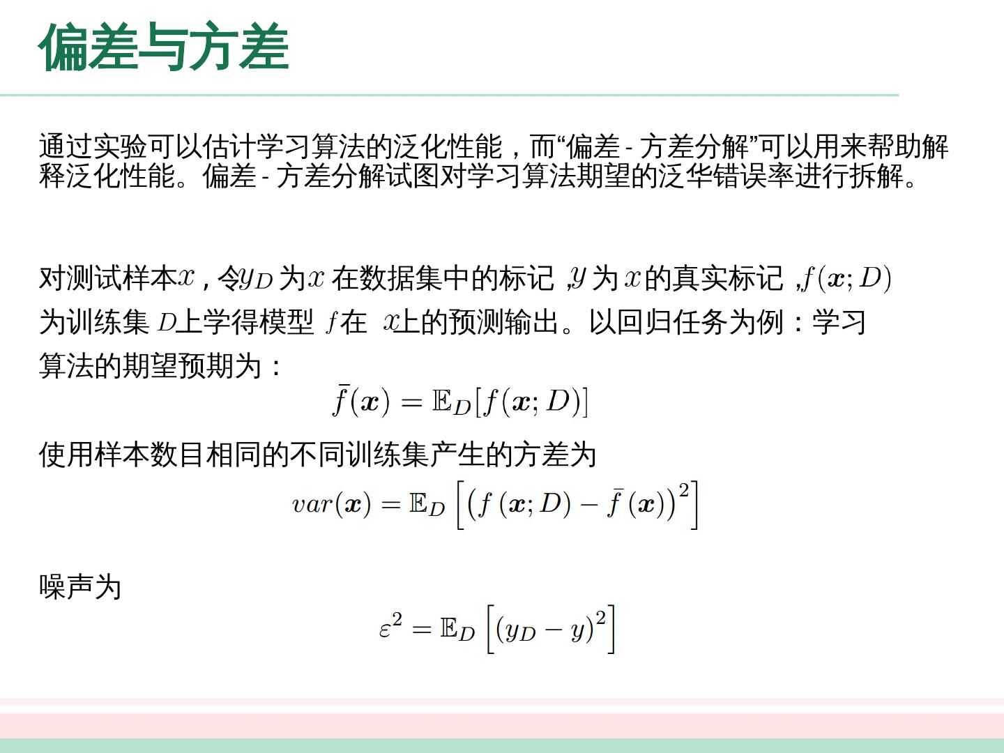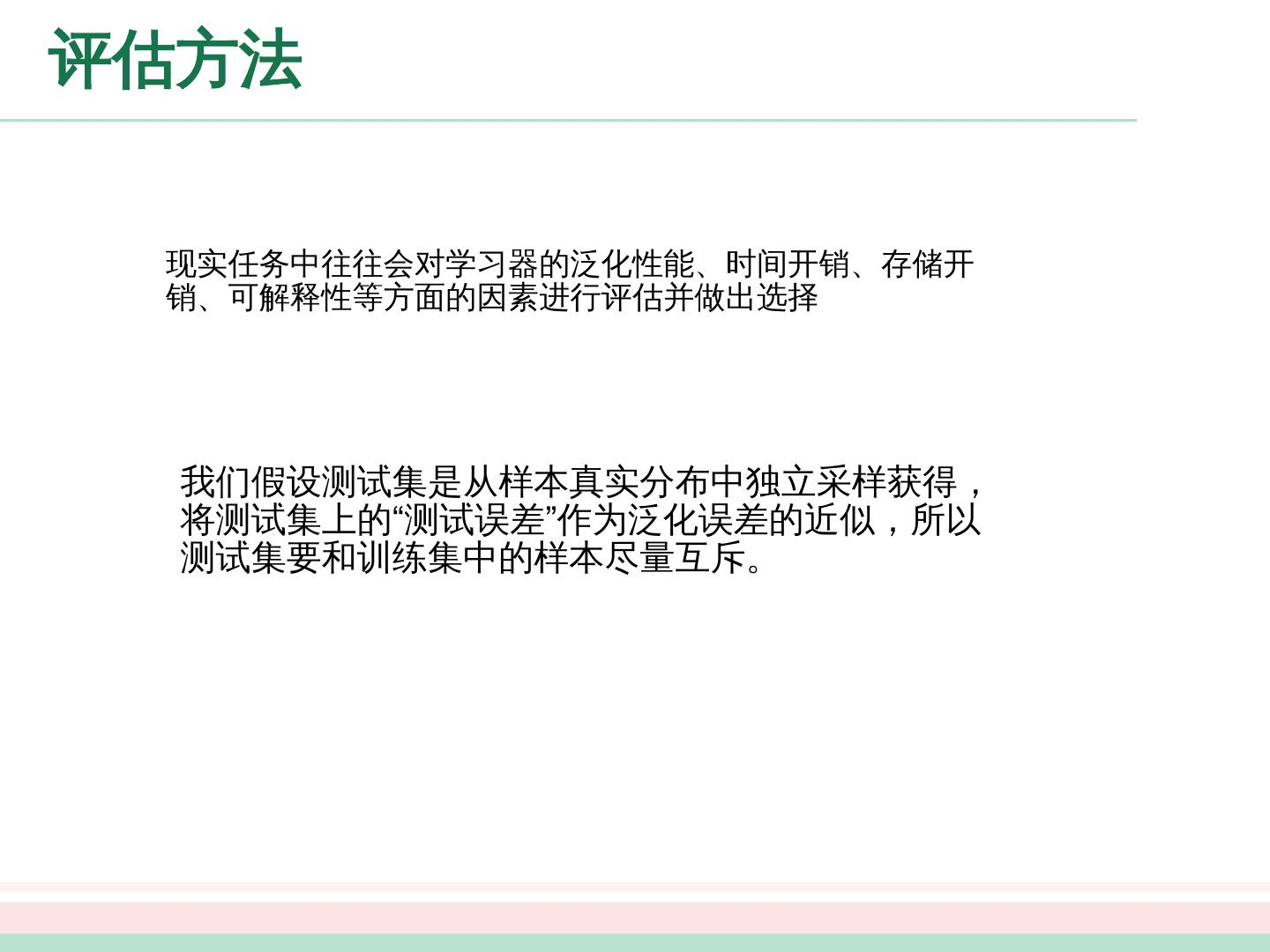8 .评估方法 现实 任务中往往会 对 学习器的泛化性能、时间开销、存储开销、可解释性等方面的因素进行评估并做出选择 我们假设测试集是从样本真实分布中独立采样获得,将测试集上的“测试误差 ” 作为泛化误差的近似,所以测试集要和训练集中的样本尽量互斥。