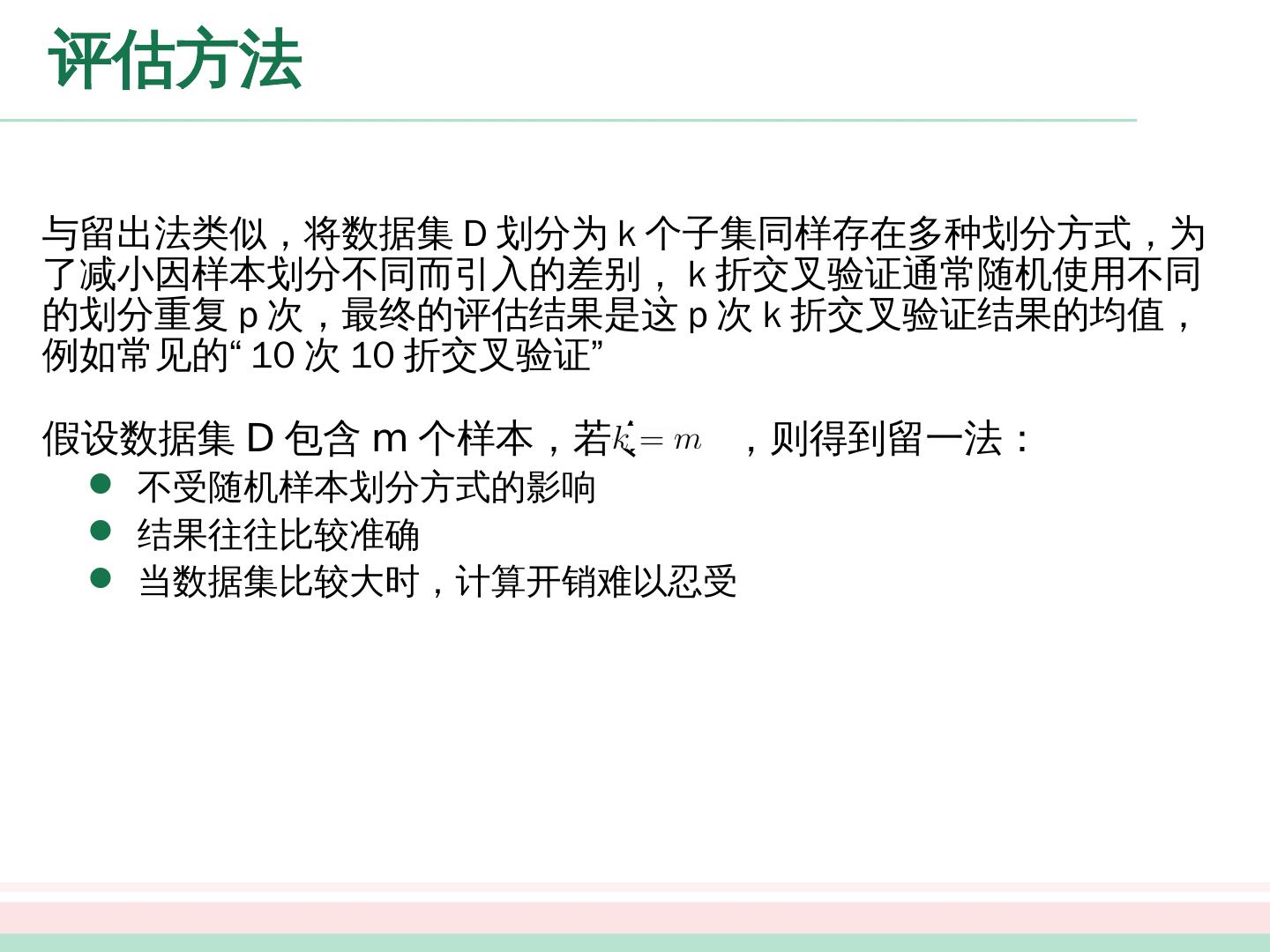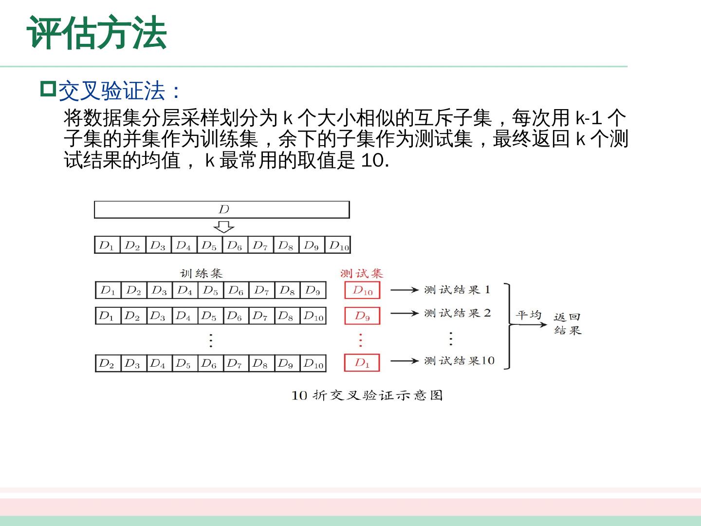 10 .评估方法 交叉 验证法: 将数据集分层采样划分为 k 个大小相似的互斥子集,每次用 k-1 个子集的并集作为训练集,余下的子集作为测试集,最终返回 k 个测试结果的均值, k 最常用的取值是 10 .