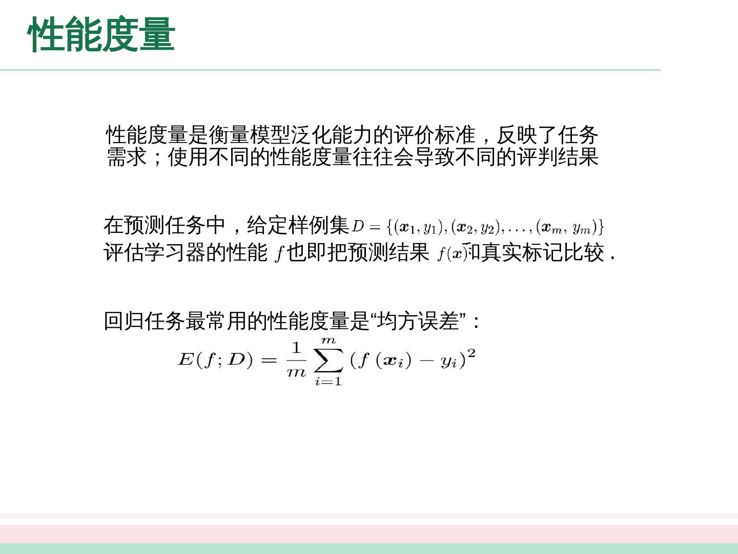 14 .性能度量 性能度量是衡量模型泛化能力的评价标准,反映了任务需求;使用不同的性能度量往往会导致不同的评判结果 在预测任务中,给定样例集 评估学习器的性能 也即把预测结果 和真实标记比较 . 回归任务最常用的性能度量是“均方误差”: