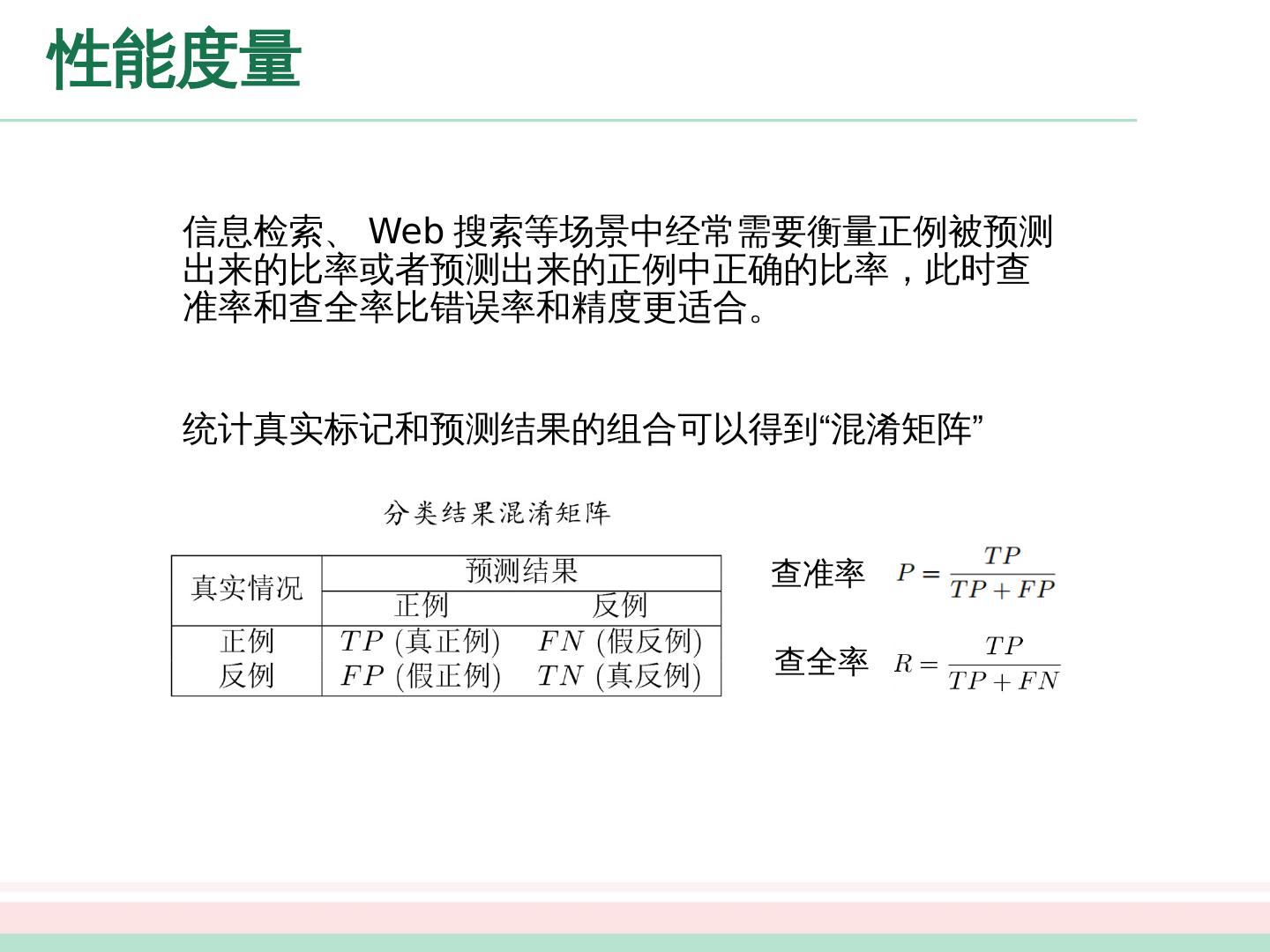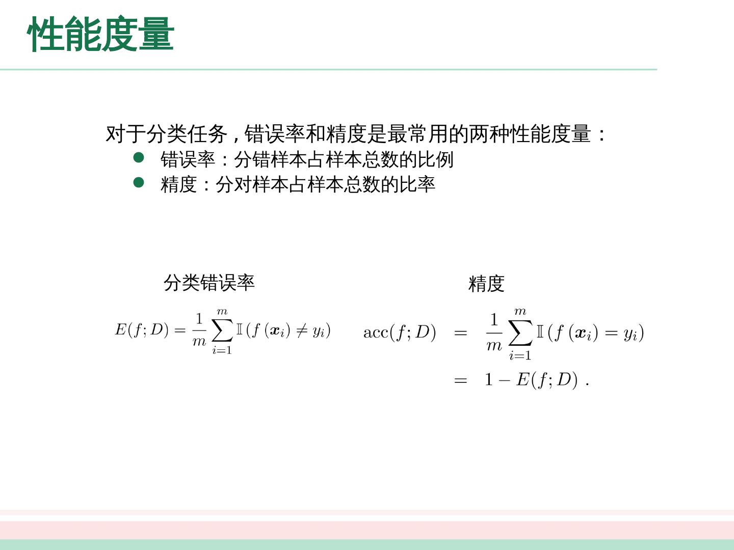 15 .性能度量 对于分类任务 , 错误率和精度是最常用的两种性能度量: 错误率:分错样本占样本总数的比例 精度:分对样本占样本总数的比率 分类错误率 精度