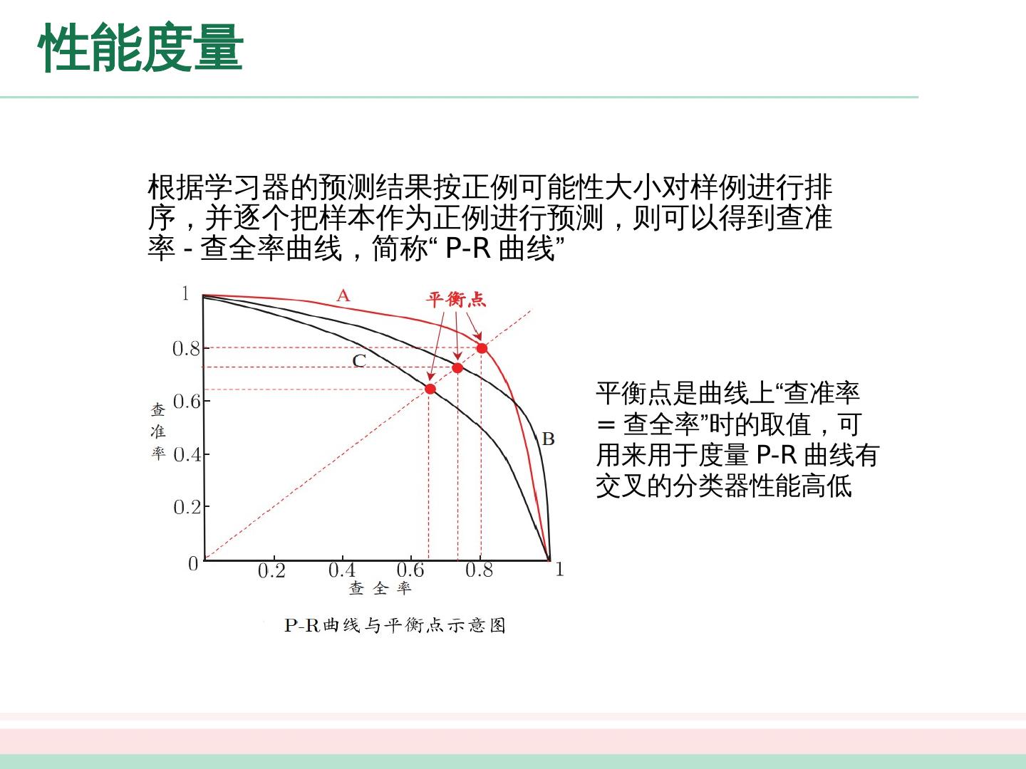17 .性能度量 根据学习器的预测结果按正例可能性大小对样例进行排序,并逐个把样本作为正例进行预测,则可以得到查准率 - 查全率曲线,简称“ P-R 曲线” 平衡点是 曲线上 “查准率 = 查全率”时的取值,可用来用于度量 P-R 曲线有交叉的分类器性能高低