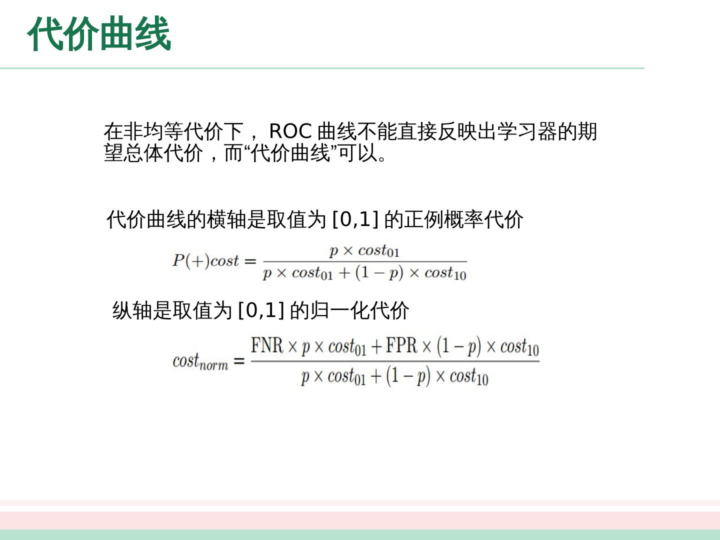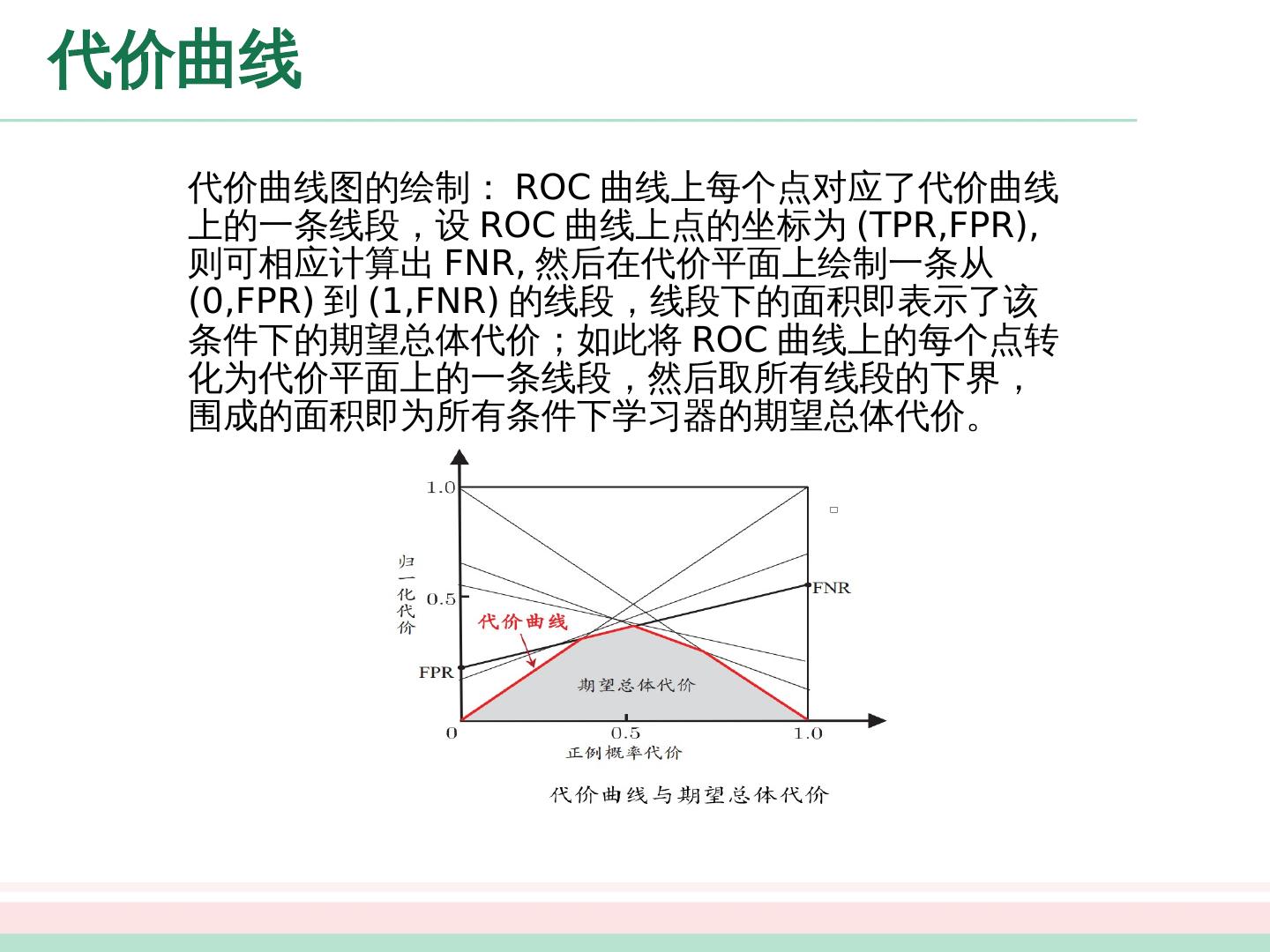 24 .代价曲线 代价曲线图的绘制: ROC 曲线上每个点对应了代价曲线上的一条线段,设 ROC 曲线上点的坐标为 (TPR,FPR), 则可相应计算出 FNR, 然后在代价平面上绘制一条从 (0,FPR) 到 (1,FNR) 的线段,线段下的面积即表示了该条件下的期望总体代价;如此将 ROC 曲线上的每个点转化为代价平面上的一条线段,然后取所有线段的下界,围成的面积即为所有条件下学习器的期望总体代价。