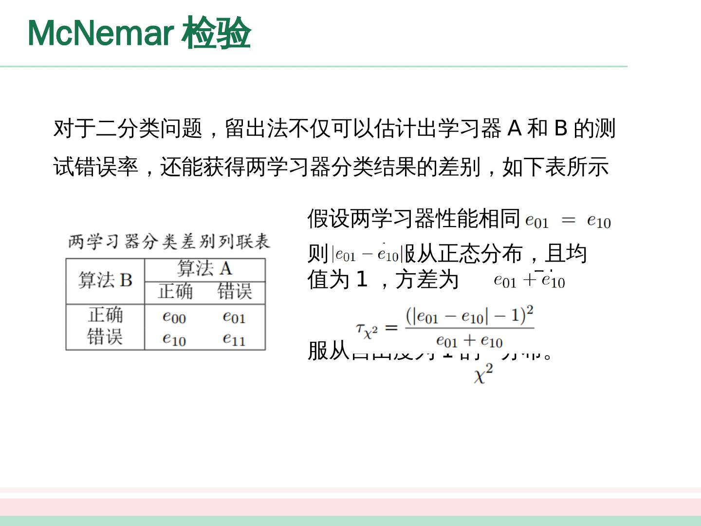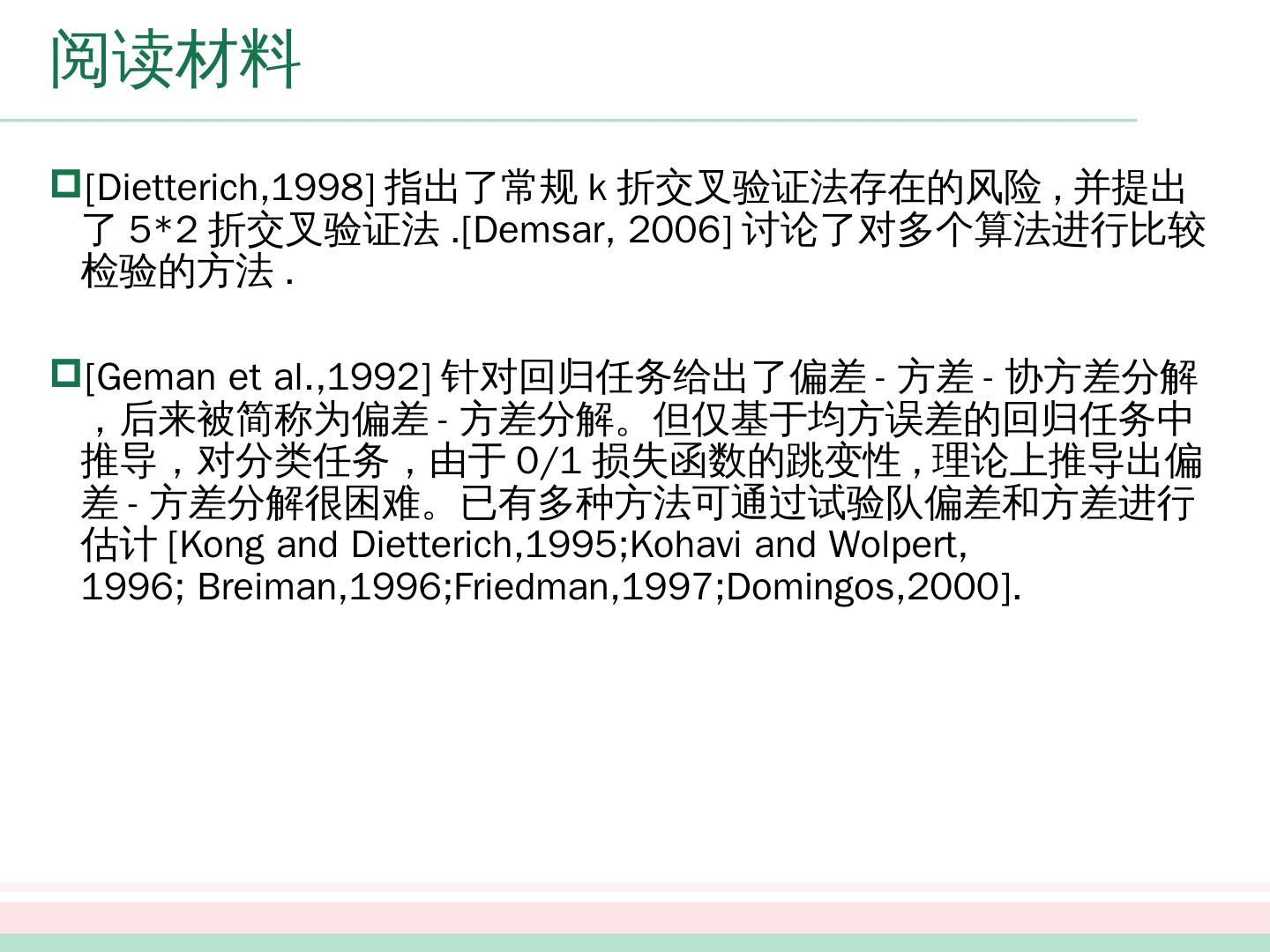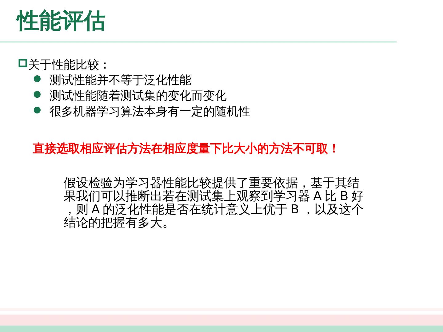 28 .交叉验证 t 检验 现实任务中,更多时候需要对不同学习器的性能进行比较 对两个学习器 A 和 B, 若 k 折交叉验证得到的测试错误率分别为 和 ,可用 k 折交叉验证“成对 t 检验”进行比较检验。若两个学习器的性能相同,则他们使用相同的训练 / 测试集得到的测试错误率应相同,即 .