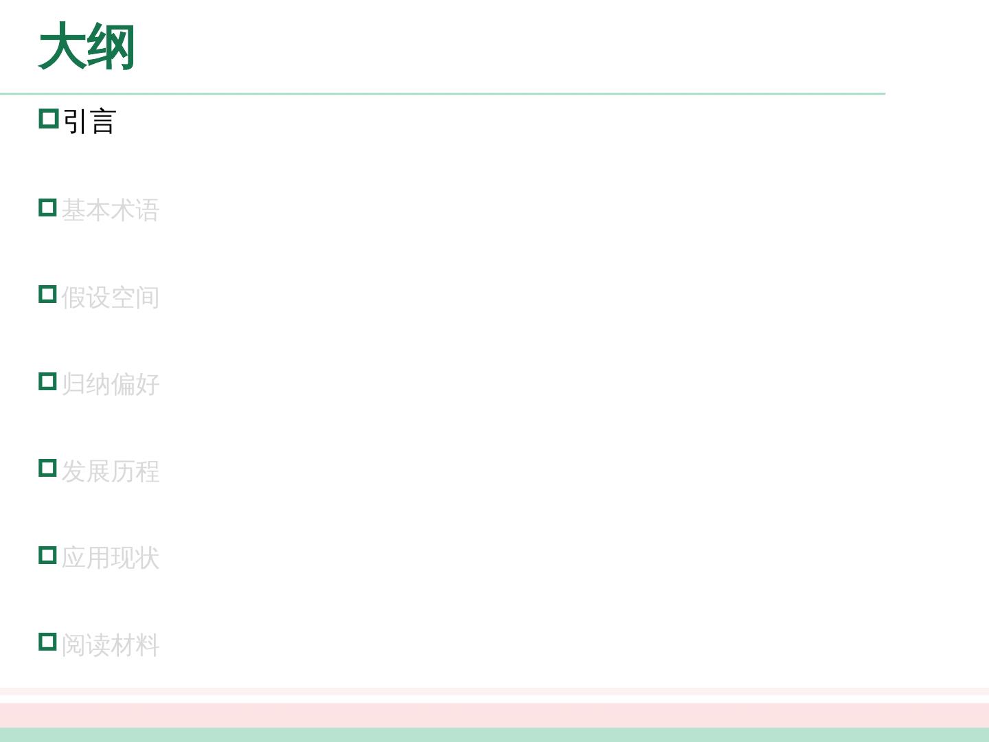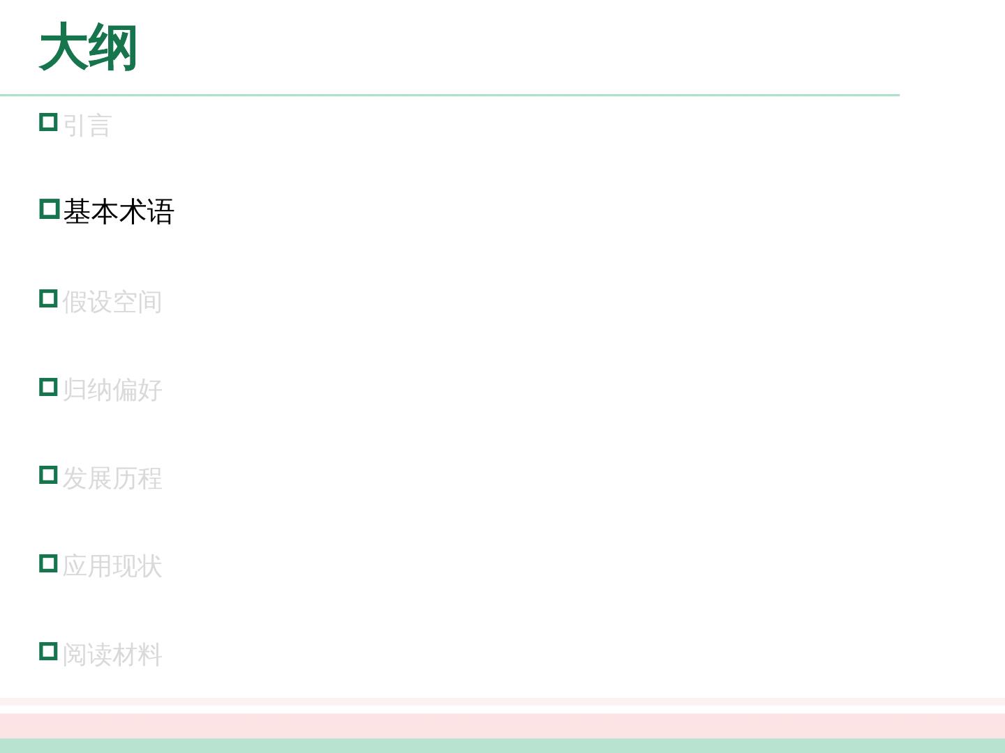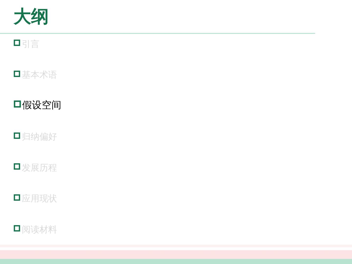 3 .大纲 引言 基本术语 假设空间 归纳偏好 发展历程 应用现状 阅读材料