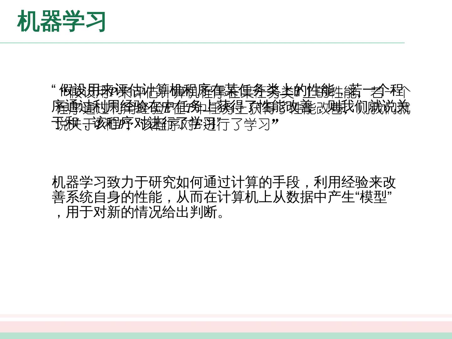4 .机器学习 “假设用 来评估计算机程序在某任务类 上的性能,若一个程序通过利用经验 在 中任务上获得了性能改善,则我们就说关于 和 ,该程序对 进行了学习” 机器学习致力于研究 如何 通过计算的手段,利用经验来改善系统自身的性能,从而在计算机上从数据中产生“模型”, 用于 对新的情况给出判断。