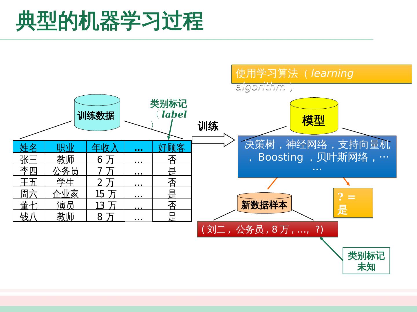 7 .典型的机器学习 过程 决策树,神经网络,支持向量机, Boosting ,贝叶斯网络, …… 模型 训练数据 类别标记 ( label ) 训练 ? = 是 新数据样本 ( 刘二 , 公务员 , 8 万 , …, ?) 类别标记未知 使用学习算法 ( learning algorithm )