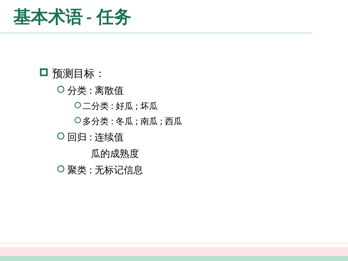 9 .基本术语 - 任务 预测目标: 分类 : 离散值 二 分类 : 好瓜 ; 坏瓜 多 分类 : 冬瓜 ; 南 瓜 ; 西 瓜 回归 : 连续值 瓜 的成熟度 聚类 : 无标记信息