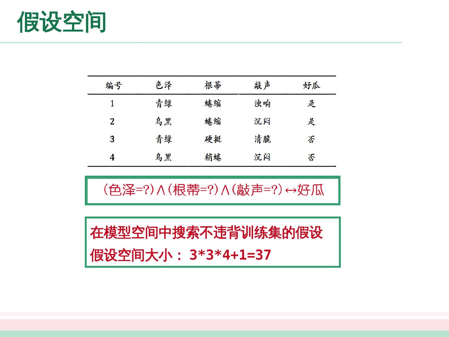 14 .假设空间 在模型空间中搜索不违背训练集的假设 假设空间大小: 3*3 * 4+1=37 ( 色泽 =?) ( 敲声 =?) 好瓜