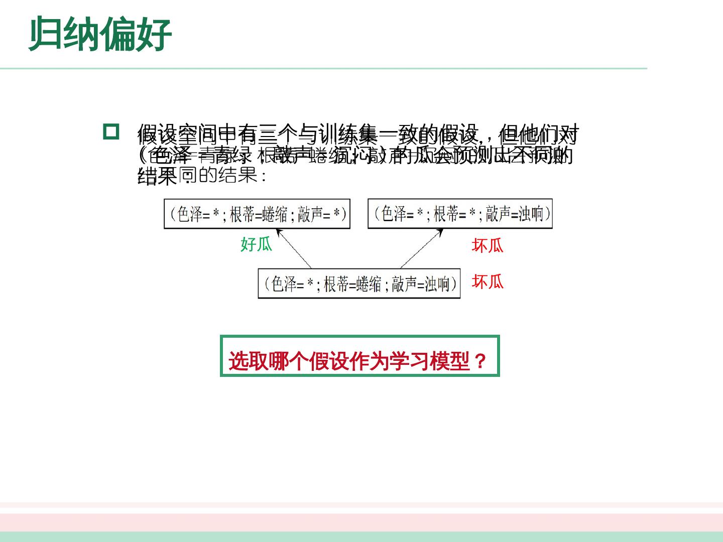 15 .归纳偏好 假设空间中有三个与训练集一致的假设,但他们对 ( 色泽 = 青绿 ; 敲 声 = 沉闷 ) 的瓜会预测出不同的结果: 好瓜 坏 瓜 坏 瓜 选取哪个假设作为学习模型?