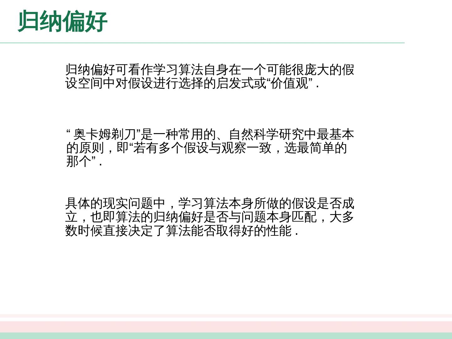 17 .归纳偏好 归纳偏好可看作学习算法自身在一个可能很庞大的假设空间中对假设进行选择的启发式或“价值观” . “奥卡姆剃刀”是一种常用的、自然科学研究中最基本的原则,即“若有多个假设与观察一致,选最简单的那个” . 具体的现实问题中,学习算法本身所做的假设是否成立,也即算法的归纳偏好是否与问题本身匹配,大多数时候直接决定了算法能否取得好的性能 .