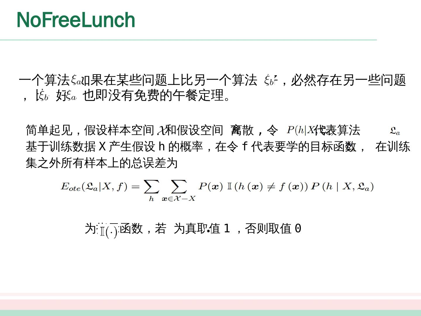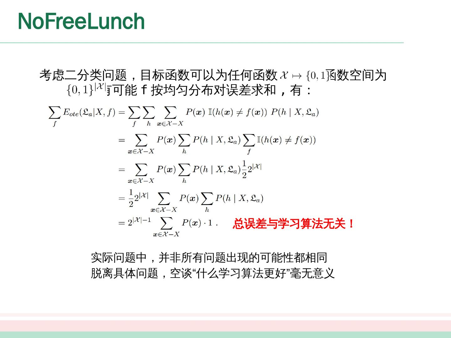 18 .NoFreeLunch 一个算法 如果 在某些问题 上 比 另一个算法 好,必然 存在另一些问题 , 比 好 , 也即没有免费的午餐定理。 简单起见,假设样本空间 和假设空间 离散 , 令 代表算法 基于训练数据 X 产生假设 h 的概率,在令 f 代表要学的目标函数, 在训练 集之外所有样本上的总误差为 为指示函数,若 为真取值 1 ,否则取值 0