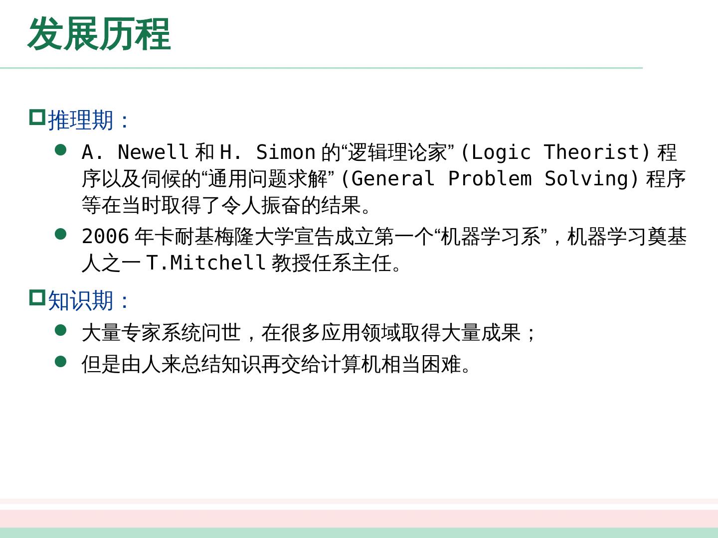 21 .发展历程 推理期 : A. Newell 和 H. Simon 的“逻辑理论家” (Logic Theorist) 程序以及伺候的“通用问题求解” (General Problem Solving) 程序等在当时取得了令人振奋的结果。 2006 年卡耐基梅隆大学宣告成立第一个“机器学习系”,机器学习奠基人之一 T.Mitchell 教授任系主任。 知识期: 大量专家系统问世,在很多应用领域取得大量成果; 但是由人来总结知识再交给计算机相当困难 。