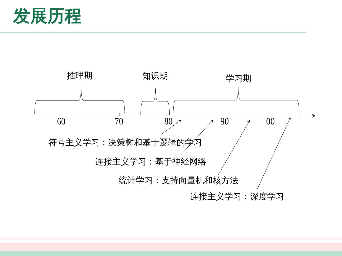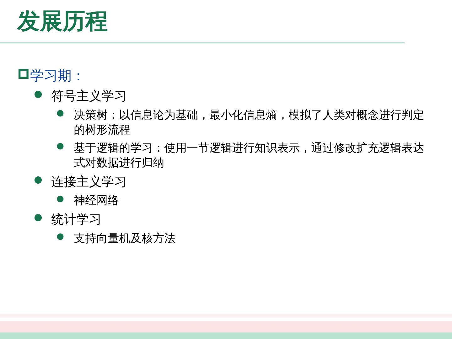 23 .发展历程 推理期 知识期 学习期 符号主义学习:决策树和基于逻辑的学习 连接主义学习:基于神经网络 统计学习:支持向量机和核方法 连接主义学习:深度学习