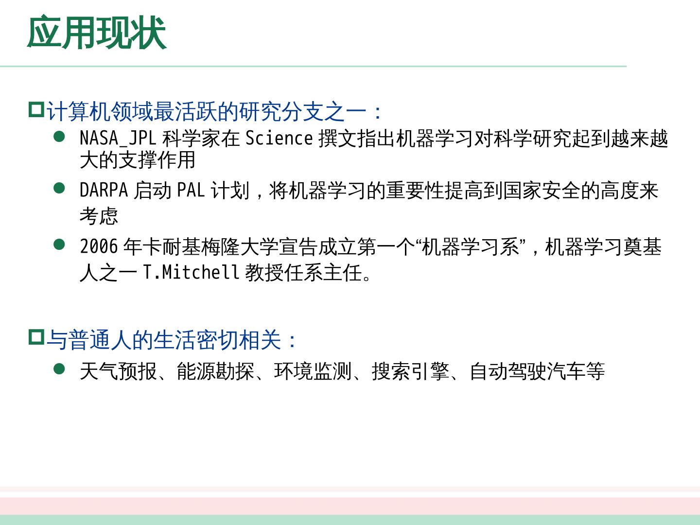 25 .应用现状 计算机领域最活跃的研究分支之一: NASA_JPL 科学家在 Science 撰文指出机器学习对科学研究起到越来越大的支撑作用 DARPA 启动 PAL 计划,将机器学习的重要性提高到国家安全的高度来考虑 2006 年卡耐基梅隆大学宣告成立第一个“机器学习系”,机器学习奠基人之一 T.Mitchell 教授任系主任。 与 普通人的生活密切相关: 天气预报、能源勘探、环境监测、搜索引擎、自动驾驶汽车 等
