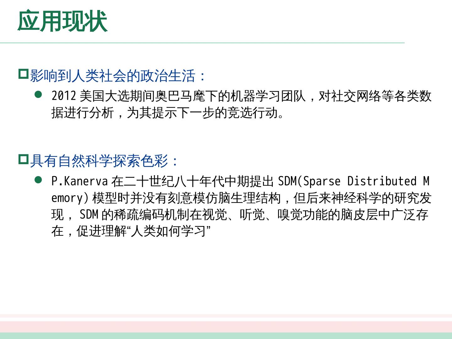 27 .应用现状 影响 到人类社会的政治生活: 2012 美国大选期间 奥巴 马麾下的机器学习团队,对社交网络等各类数据进行分析,为其提示下一步的竞选行动。 具有 自然科学探索色彩: P.Kanerva 在二十世纪八十年代中期提出 SDM(Sparse Distributed Memory) 模型时并没有刻意模仿脑生理结构,但后来神经科学的研究发现, SDM 的稀疏编码机制在视觉、听觉、嗅觉功能的脑皮层中广泛存在,促进 理解 “人类如何学习”