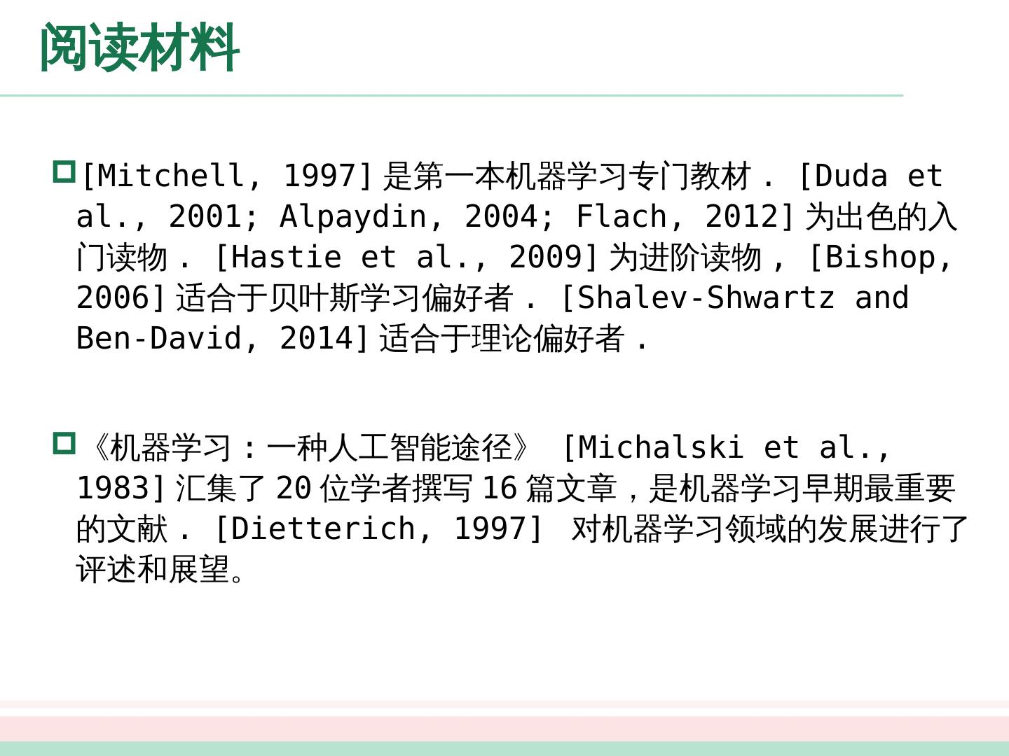 28 .阅读材料 [ Mitchell, 1997 ] 是第一本机器学习专门教材 . [ Duda et al., 2001; Alpaydin, 2004; Flach, 2012] 为出色的入门读物 . [Hastie et al., 2009] 为进阶读物 , [Bishop, 2006] 适合于贝叶斯学习偏好者 . [Shalev-Shwartz and Ben-David, 2014] 适合于理论偏好者 . 《 机器学习 : 一种人工智能途径 》 [Michalski et al., 1983 ] 汇集了 20 位学者撰写 16 篇文章,是机器学习早期最重要的文献 . [Dietterich, 1997] 对机器学习领域的发展进行了评述和展望。