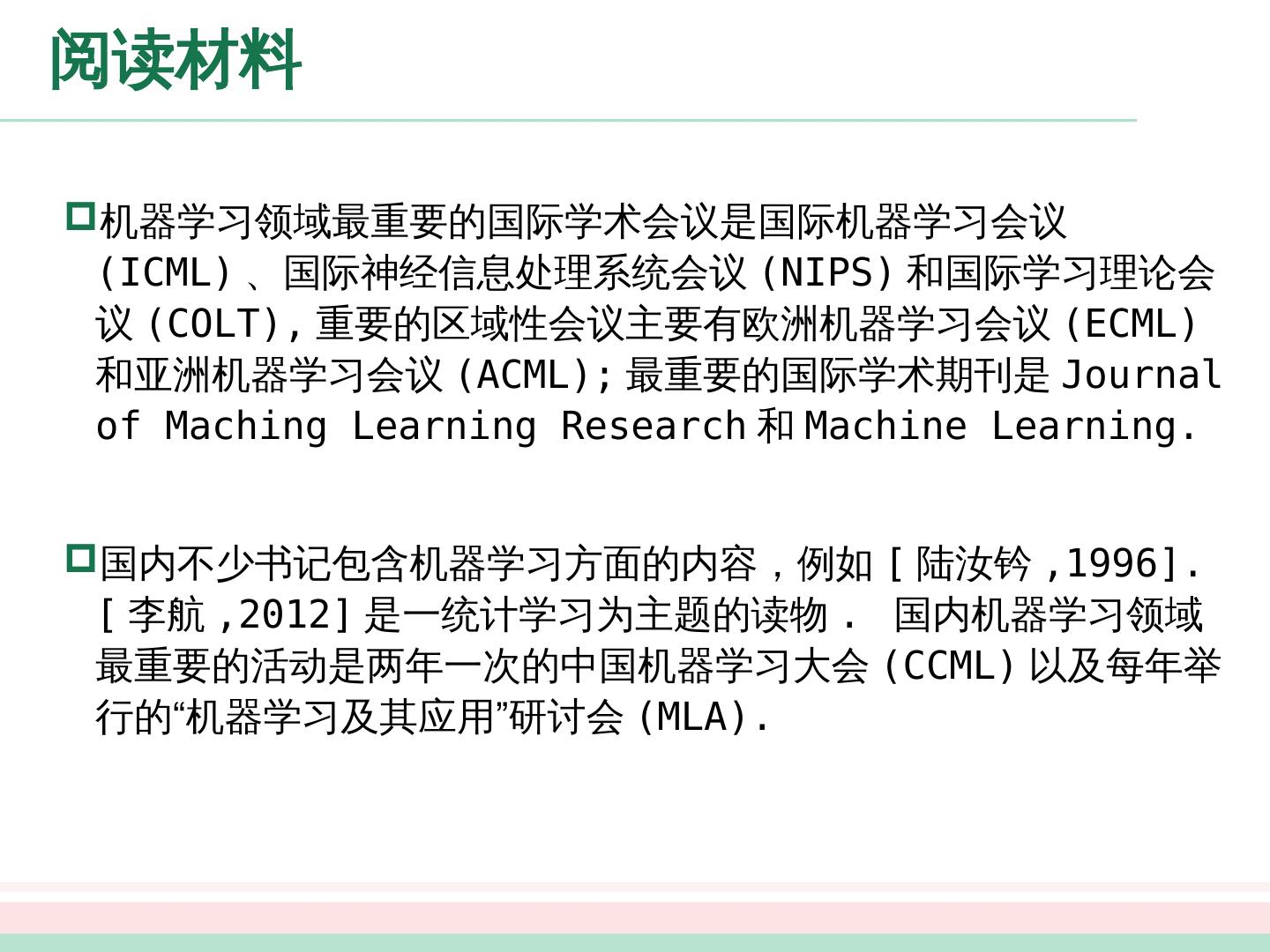29 .阅读材料 机器学习领域最重要 的 国际 学术 会议是国际机器学习会议 (ICML) 、国际神经信息处理系统会议 (NIPS) 和国际学习理论会议 (COLT), 重要的区域性会议主要有欧洲机器学习会议 (ECML) 和亚洲机器学习会议 (ACML); 最重要 的 国际 学术 期刊是 Journal of Maching Learning Research 和 Machine Learning. 国内不少书记包含机器学习方面的内容,例如 [ 陆汝钤 ,1996].[ 李航 ,2012] 是一统计学习为主题的读物 . 国内机器学习领域最重要的活动是两年一次的中国机器学习大会 (CCML) 以及每年举行的“机器学习及其应用”研讨会 (MLA).