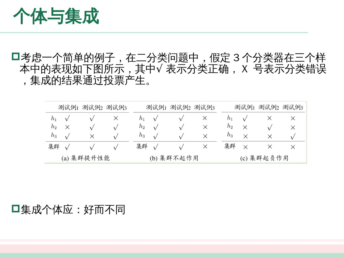 5 .个体与集成 考虑一个简单的例子,在二分类问题中,假定 3 个分类器在三个样本中的表现如下图所示,其中 √ 表示分类正确, X 号表示分类错误,集成的结果通过投票产生。 集成个体应:好而不同