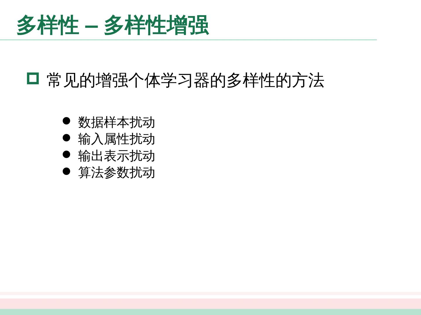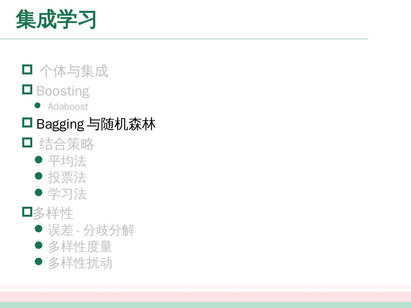 3 .集成学习 个体 与集成 Boosting Adaboost Bagging 与随机森林 结合策略 平均法 投票 法 学习 法 多样性 误差 - 分歧分解 多样性度量 多样性扰动